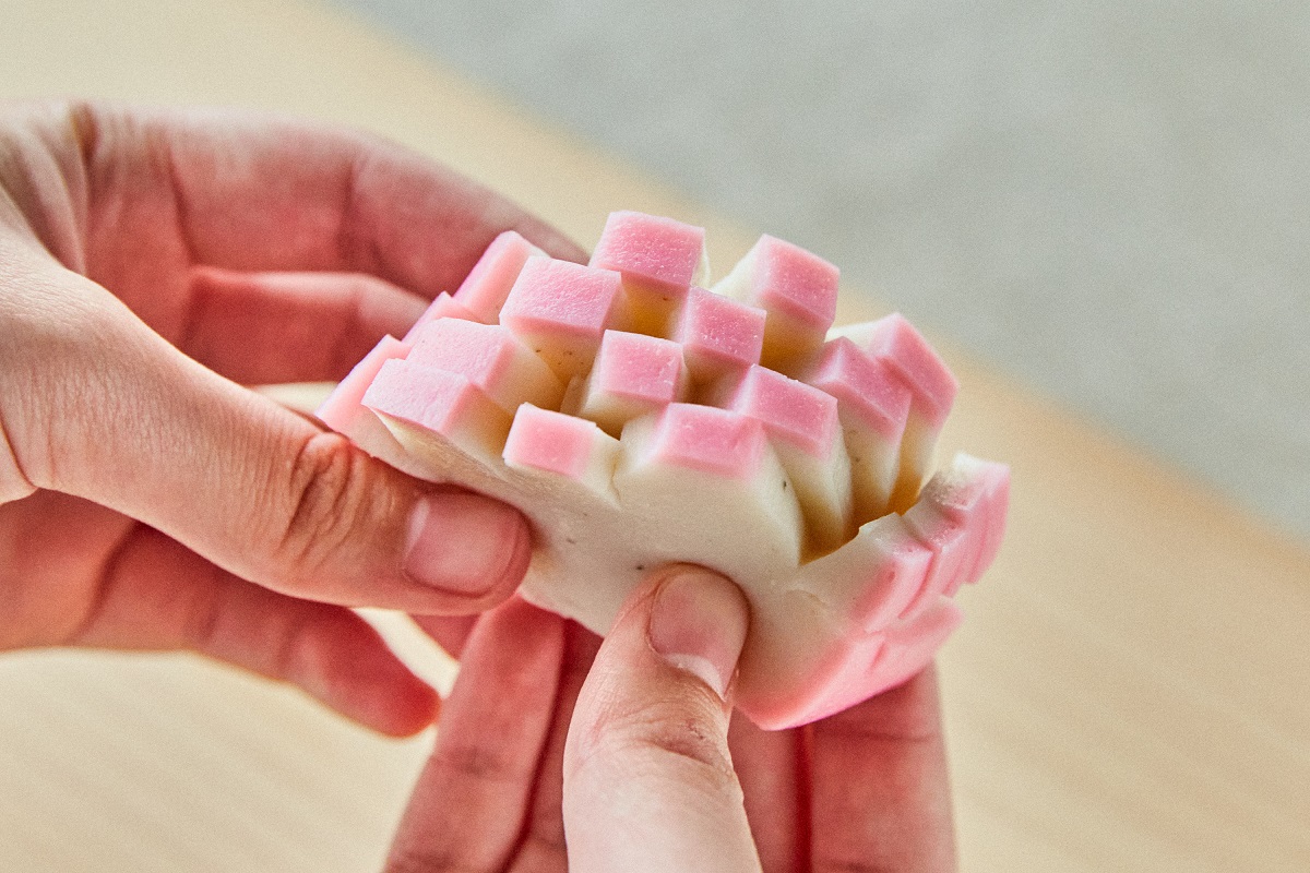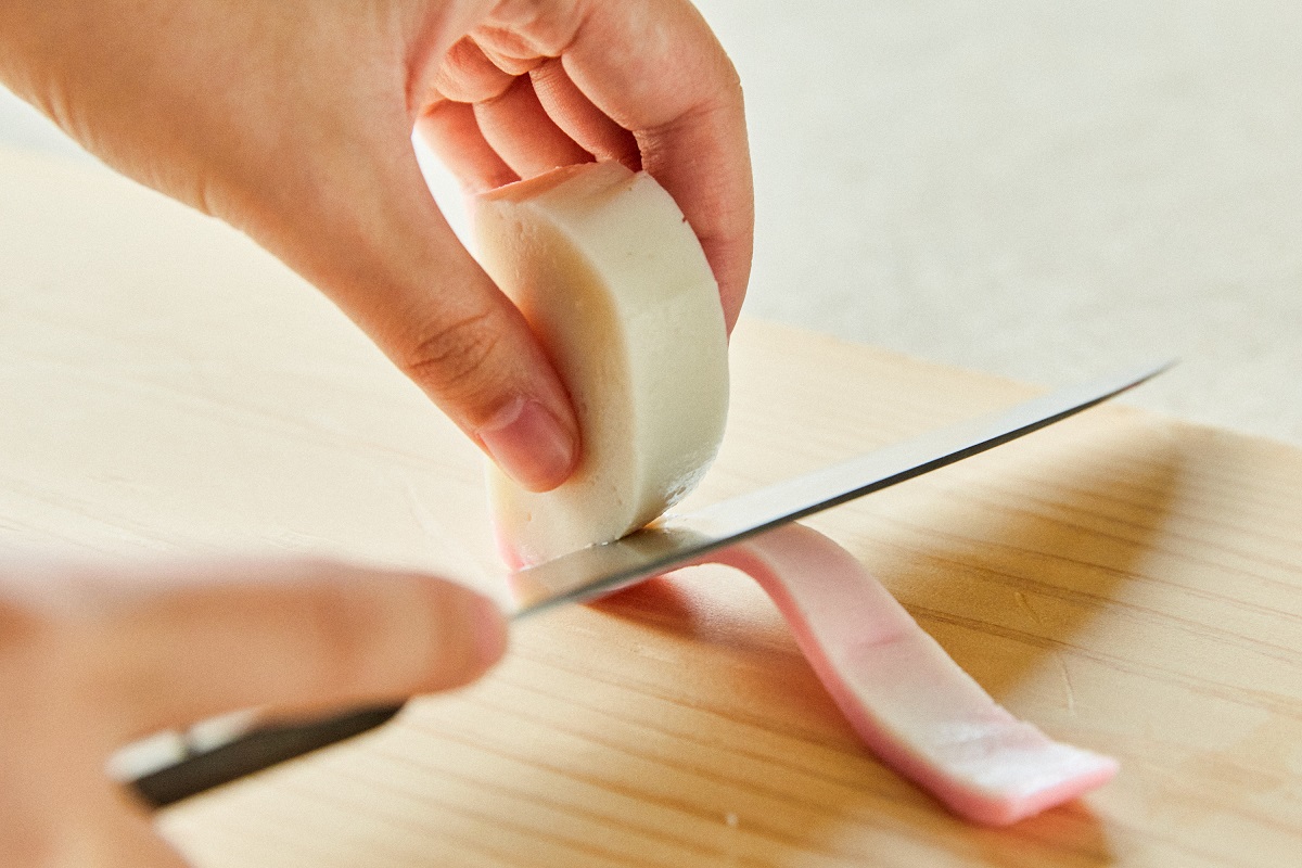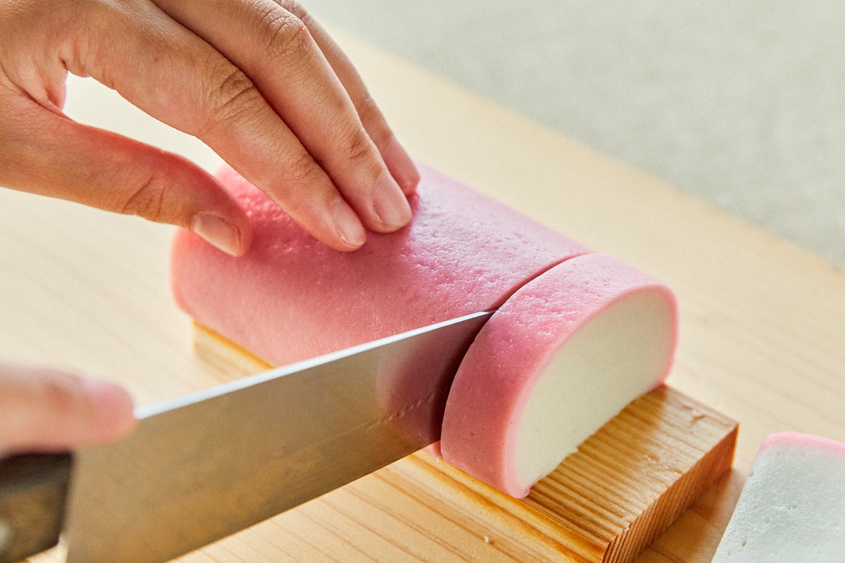 今回使用したかまぼこは「謹上蒲鉾」です。高級魚のグチにタイ類やタラ類をブレンドし、小田原かまぼこならではのぷりっとした弾力を引き出しています。本記事の飾り切りのような、厚く切って弾力を楽しむものに向いております。