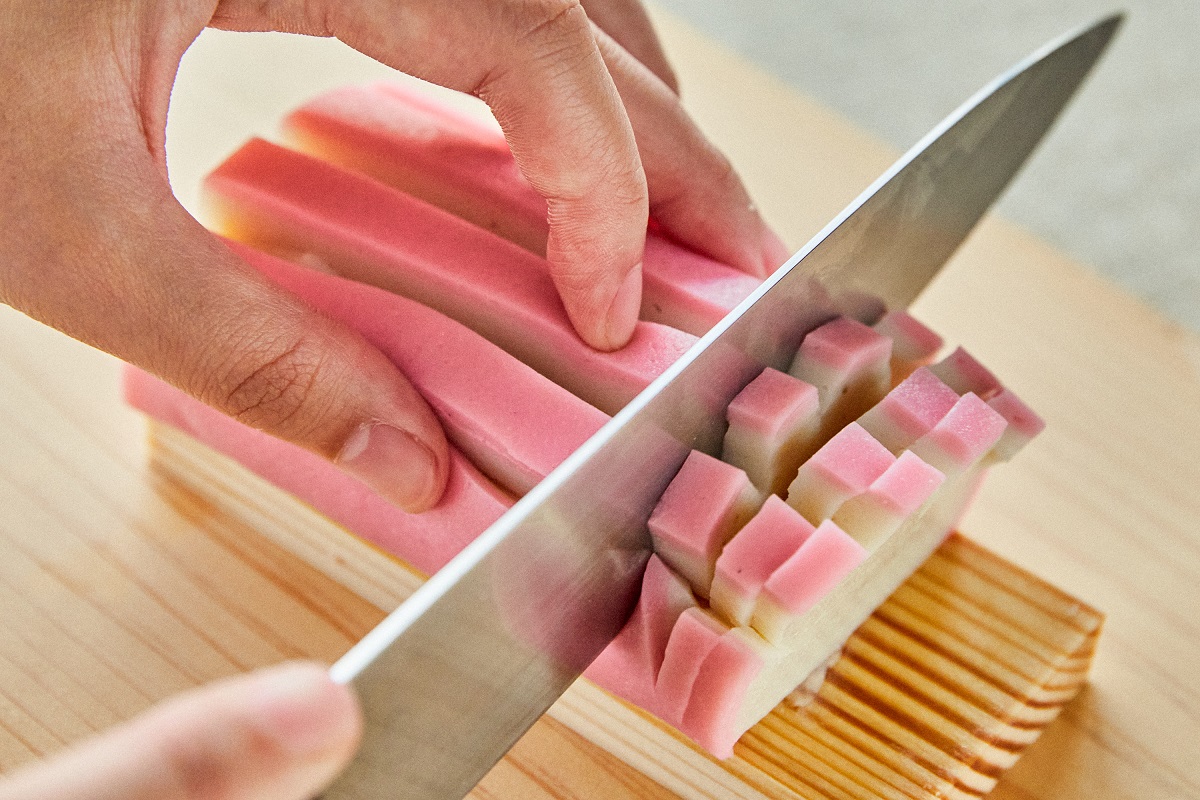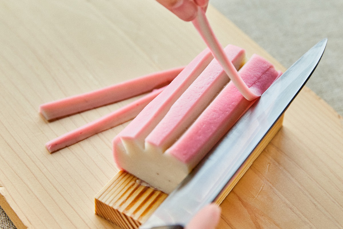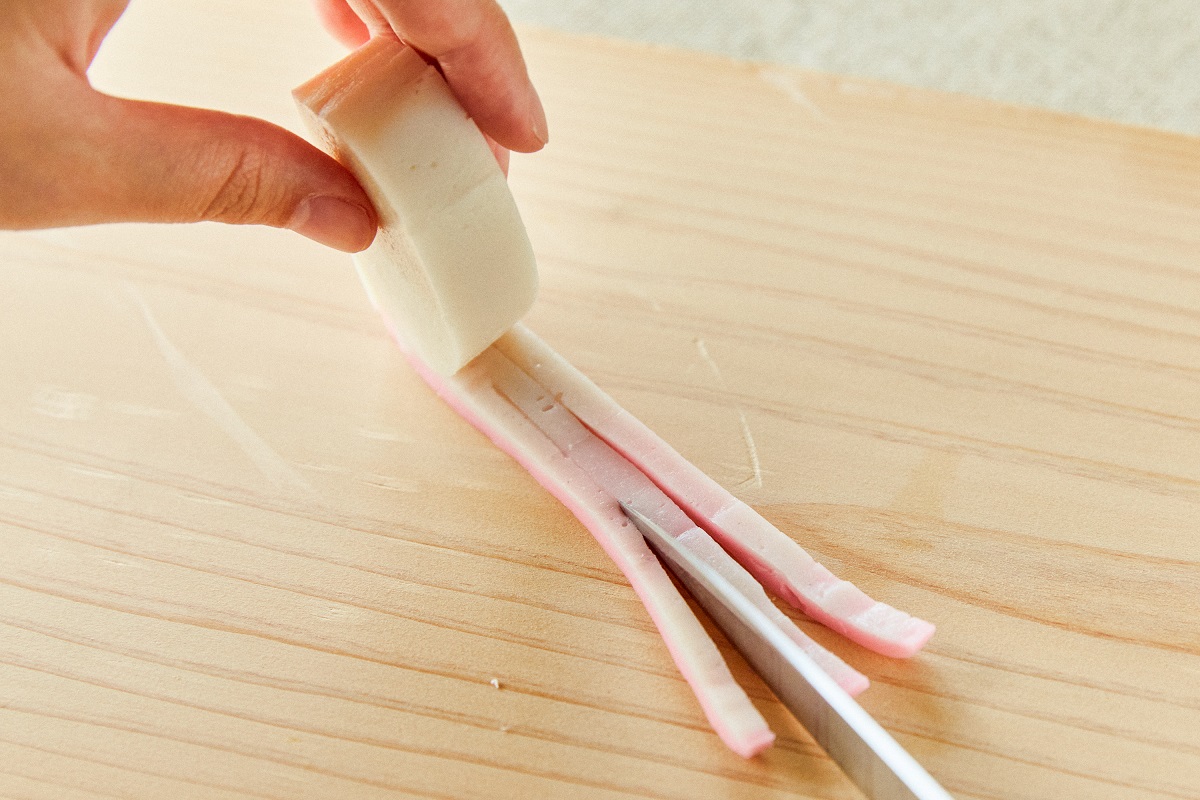 ①紅かまぼこから、三角柱を4本分抜き切りする