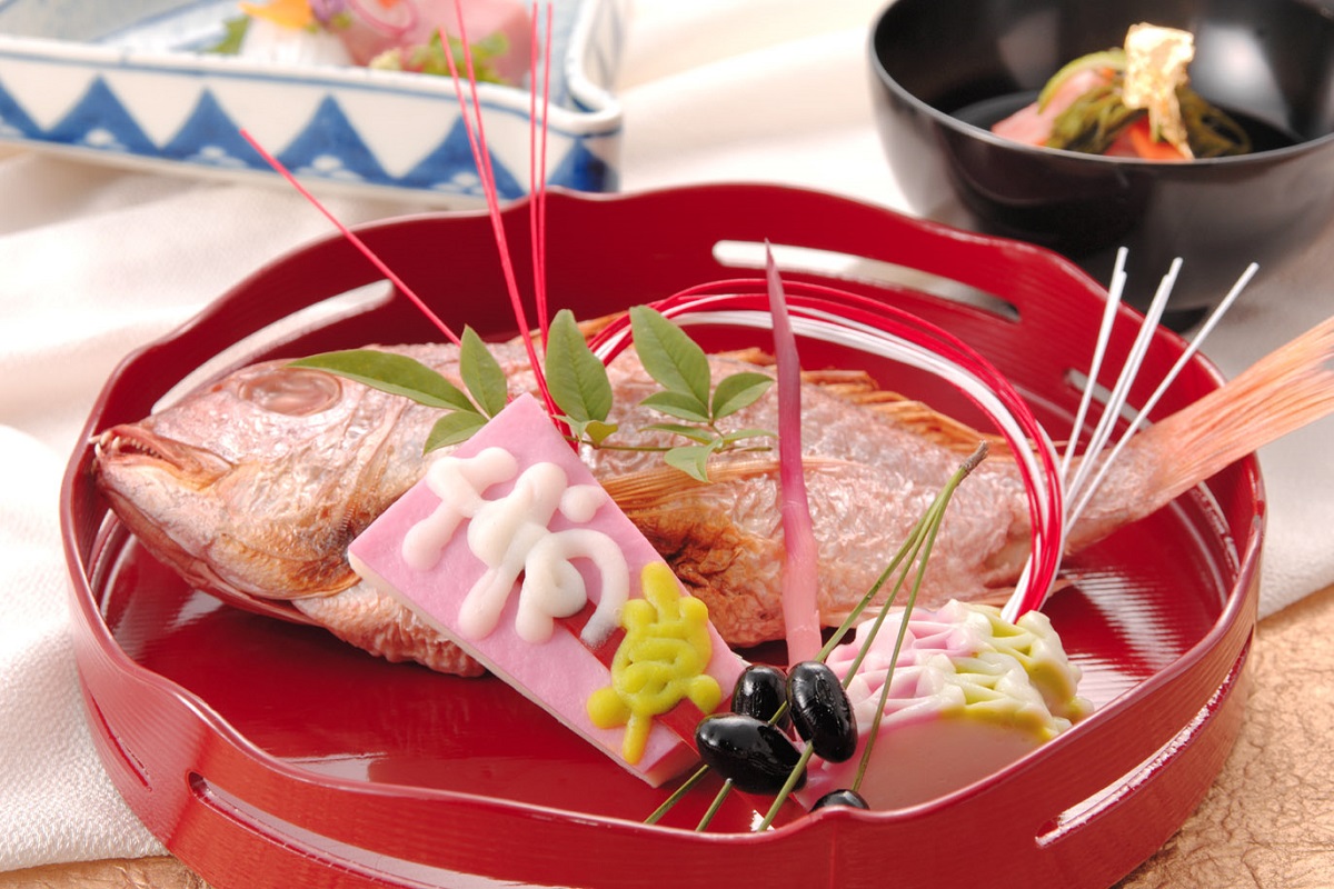 鯛は、おせち料理では焼いた切り身を入れることが多い食材です。恵比寿様が持っている魚ということから七福神信仰とも繋がっており、「めでたい」と縁起の良い魚です。赤色で姿形も美しいことから、祝い事に使われています。