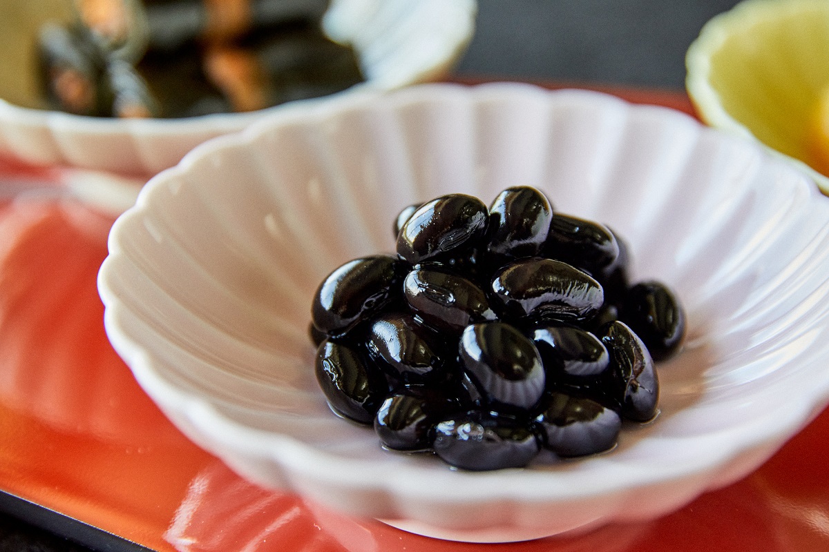 黒豆は、甘く味付けされており、「まめに働けるように」「元気で働けるように」といった健康や精励を意味しています。黒色は邪気を払う色ともされており、黒く日に焼けるまで朗らかに働くという意味もあります。