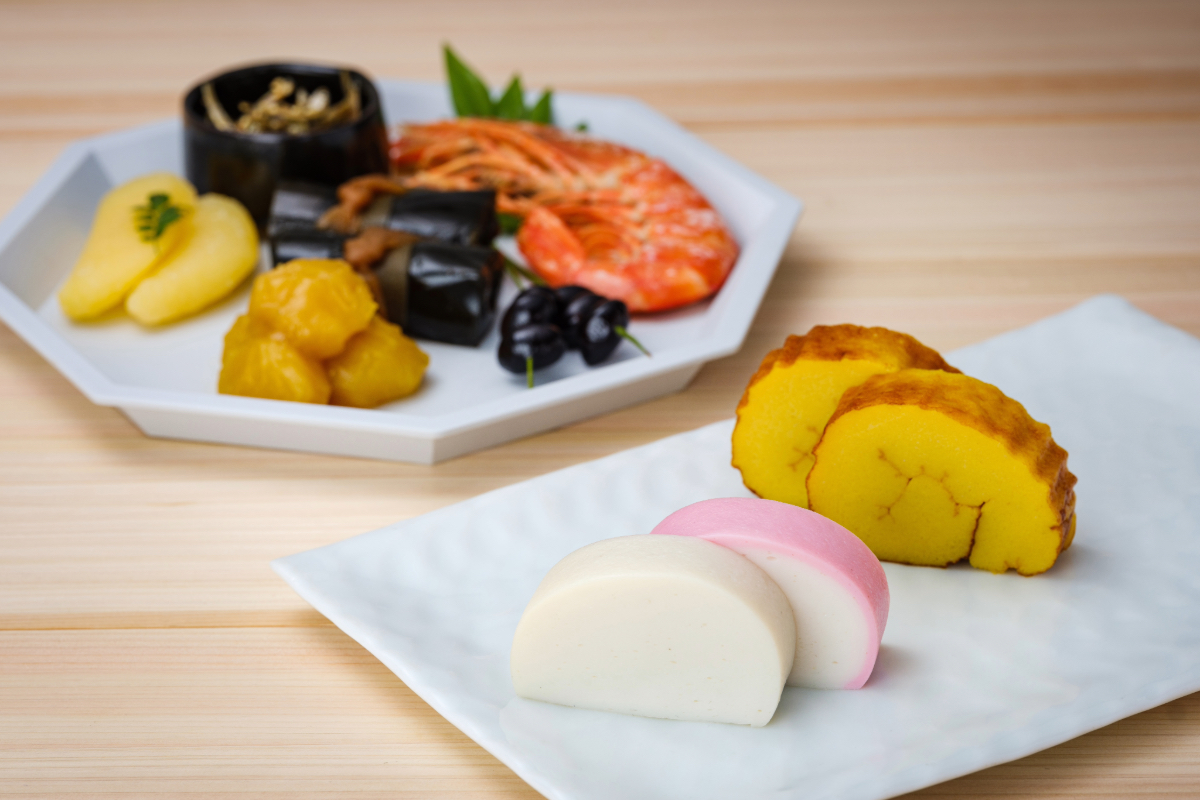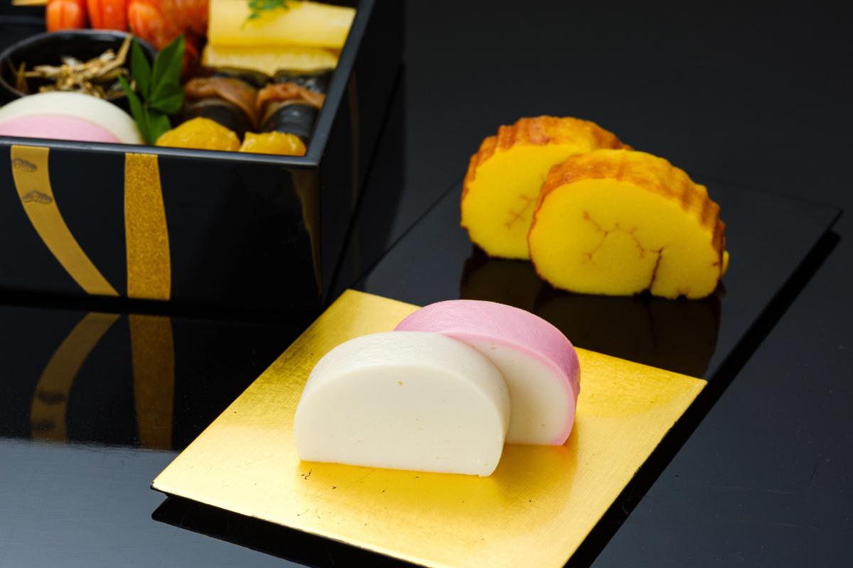 かまぼこは、あっさりした味わいで箸休めにもぴったりです。半月の形が元旦の「初日の出」のようだとされ、新年の祝いにうってつけの料理です。紅白の紅は「慶び」「魔除け」、白は「神聖」「清浄」を表します。