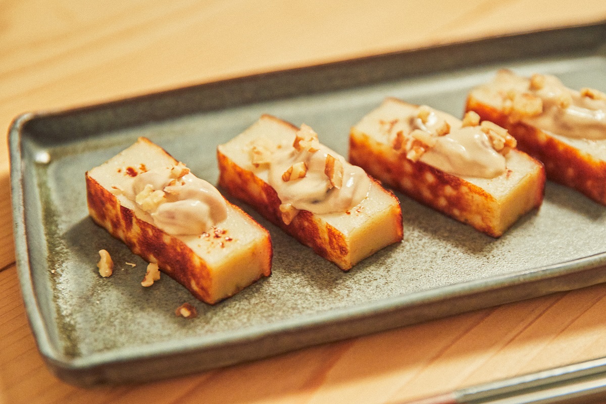 やき角」をこんがりふんわり焼いて、上に塩辛クリームチーズをのせた一皿です。