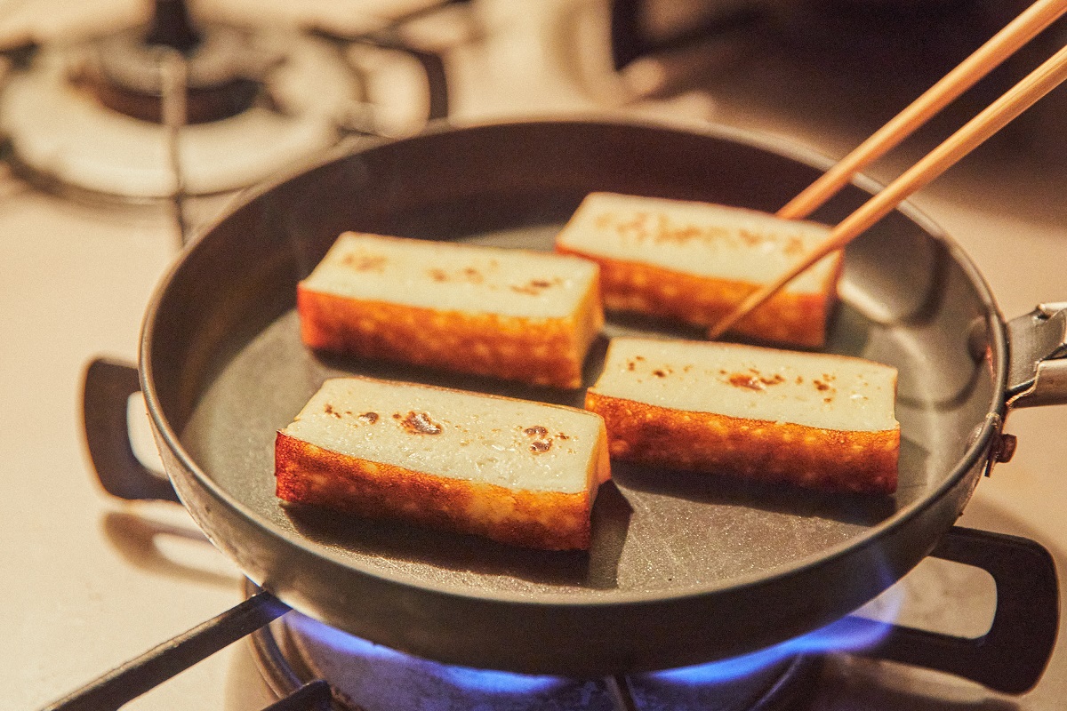 やき角の白い面をフライパン(中火)で、焦げ目がつくまで両面焼く