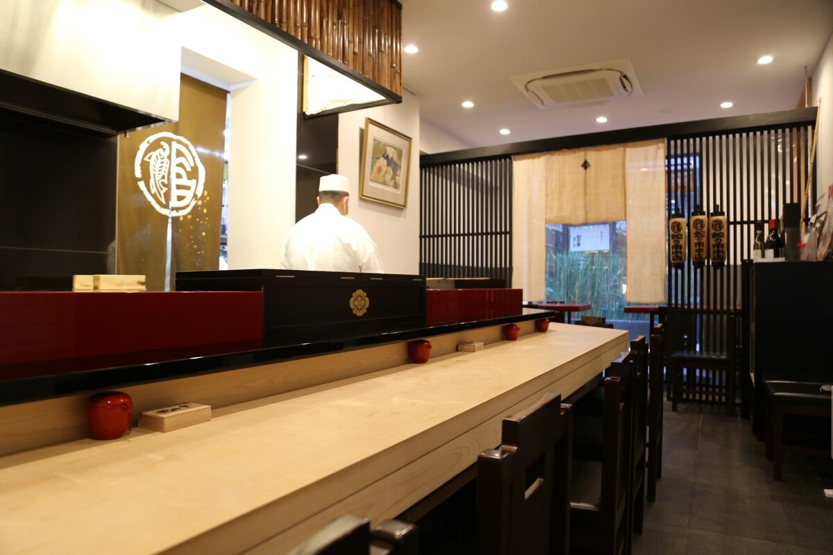 そうなんです。店内の設えは、半世紀ほど前の蛇の市をイメージしました。白木を使い、付け台には朱と黒の塗りを施しています。テーブル席からは、中庭の緑を望めますよ。目指しているのは、お寿司を気軽に食べられるお店。接客は節度を持ちながら、堅苦しくない雰囲気づくりに努めています。