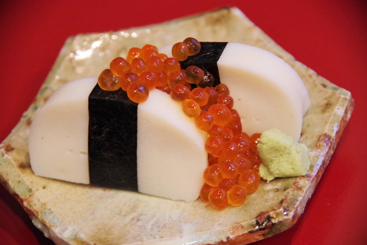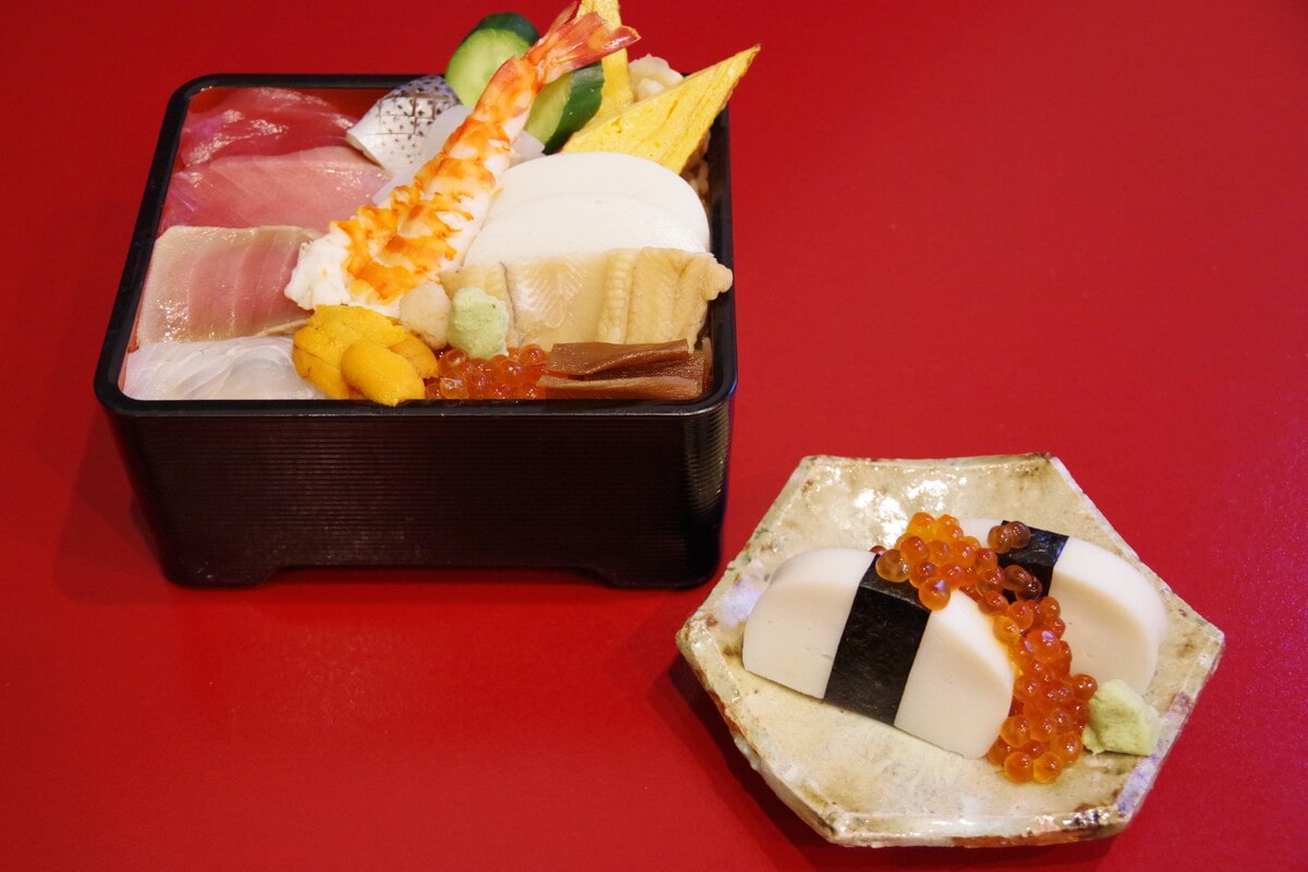 ―― 続いては「鞍掛(くらかけ)にぎり」ですね。弾力のあるかまぼこと、しっかりした食感の酢飯が絶妙に合いますね。いくらも添えられていて贅沢です。