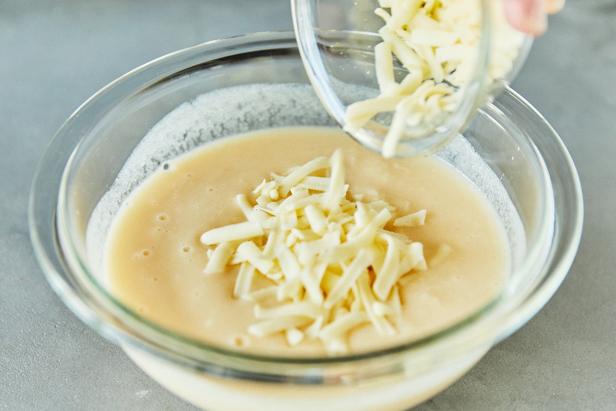 ②すりおろしたじゃがいも、卵、チーズを入れて、すり身とよく混ぜる。