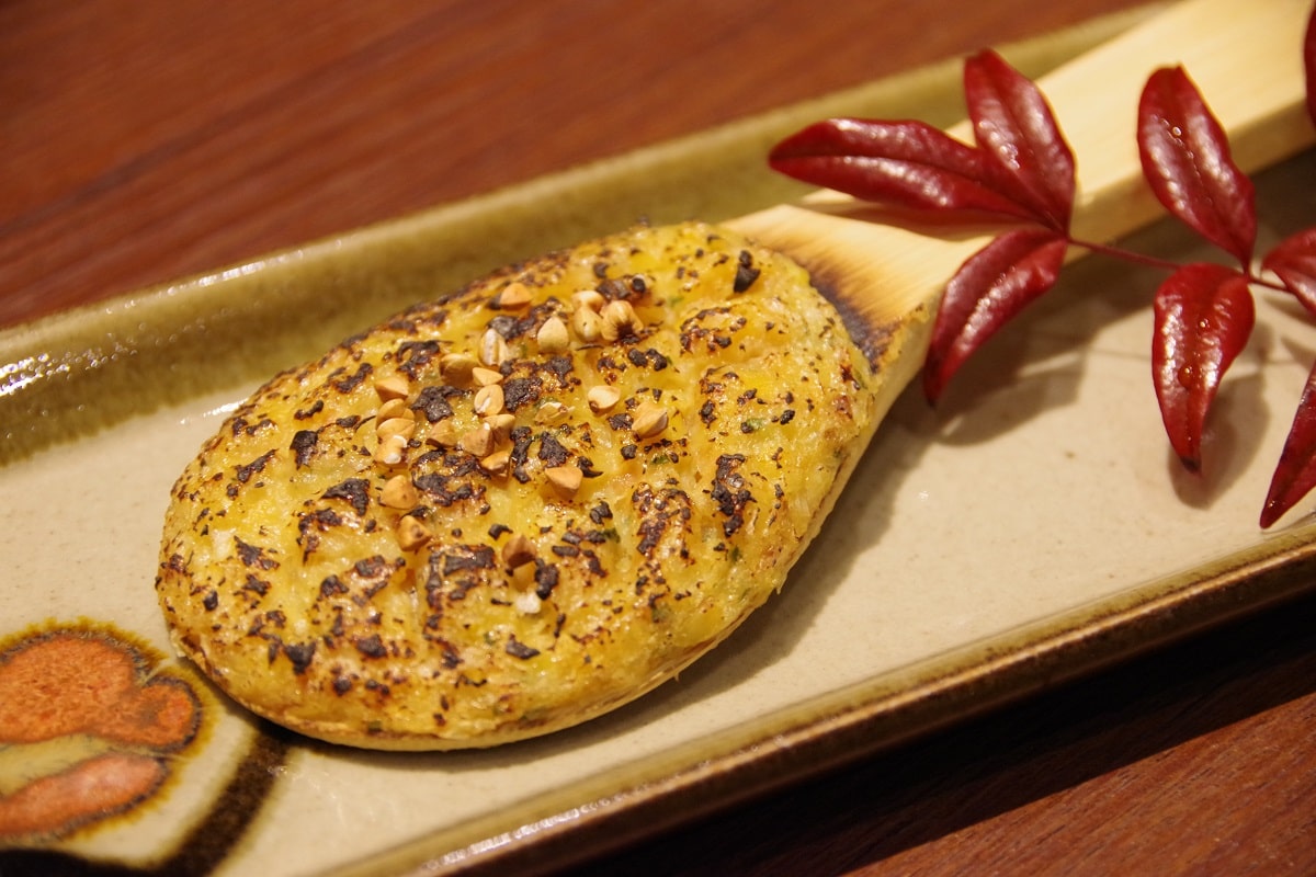 もろみの入った白味噌に、かつお節と長ねぎ、ゆずや大葉などを刻んで練り込んでいます。しゃもじに乗せて炙ってふっくらと焼き上げ、仕上げに炒ったそばの実を添えて出来上がり。香ばしい風味で、日本酒に最適な蕎麦前ではないでしょうか。