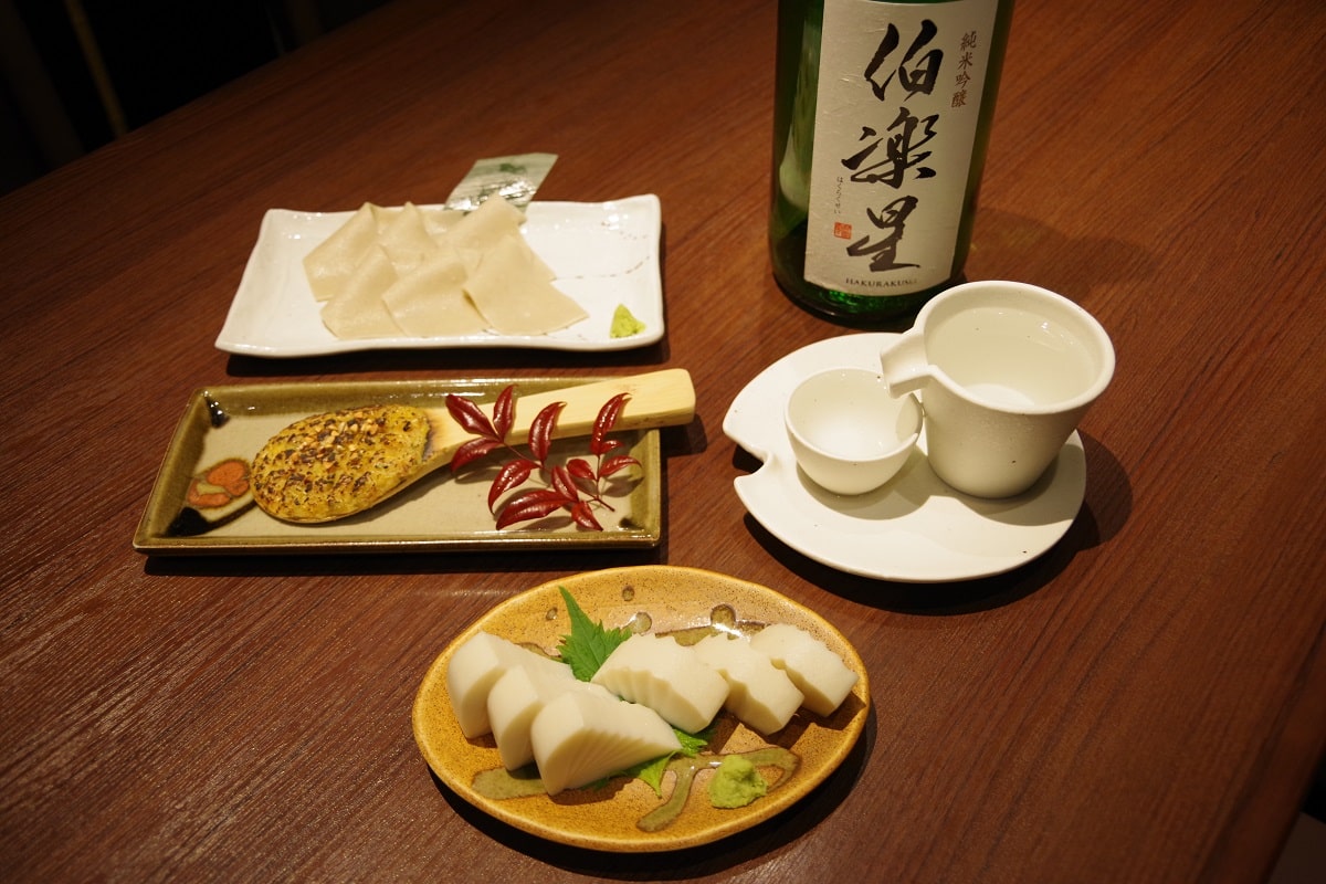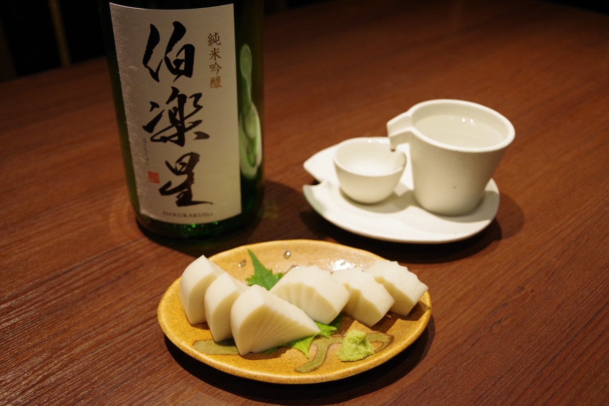 日本酒は、当店の店長と酒屋さんとでチョイスしています。今回おすすめしたいのは「伯楽星 純米吟醸」ですね。これは宮城県の酒蔵さんが、食事に合う「究極の食中酒」を意識して醸造しているお酒。味わいはすっきりとしていて、油ものにもよく合います。板わさはもちろん、どんな料理にも合わせられる「食事のとなりにあるお酒」だと思います。