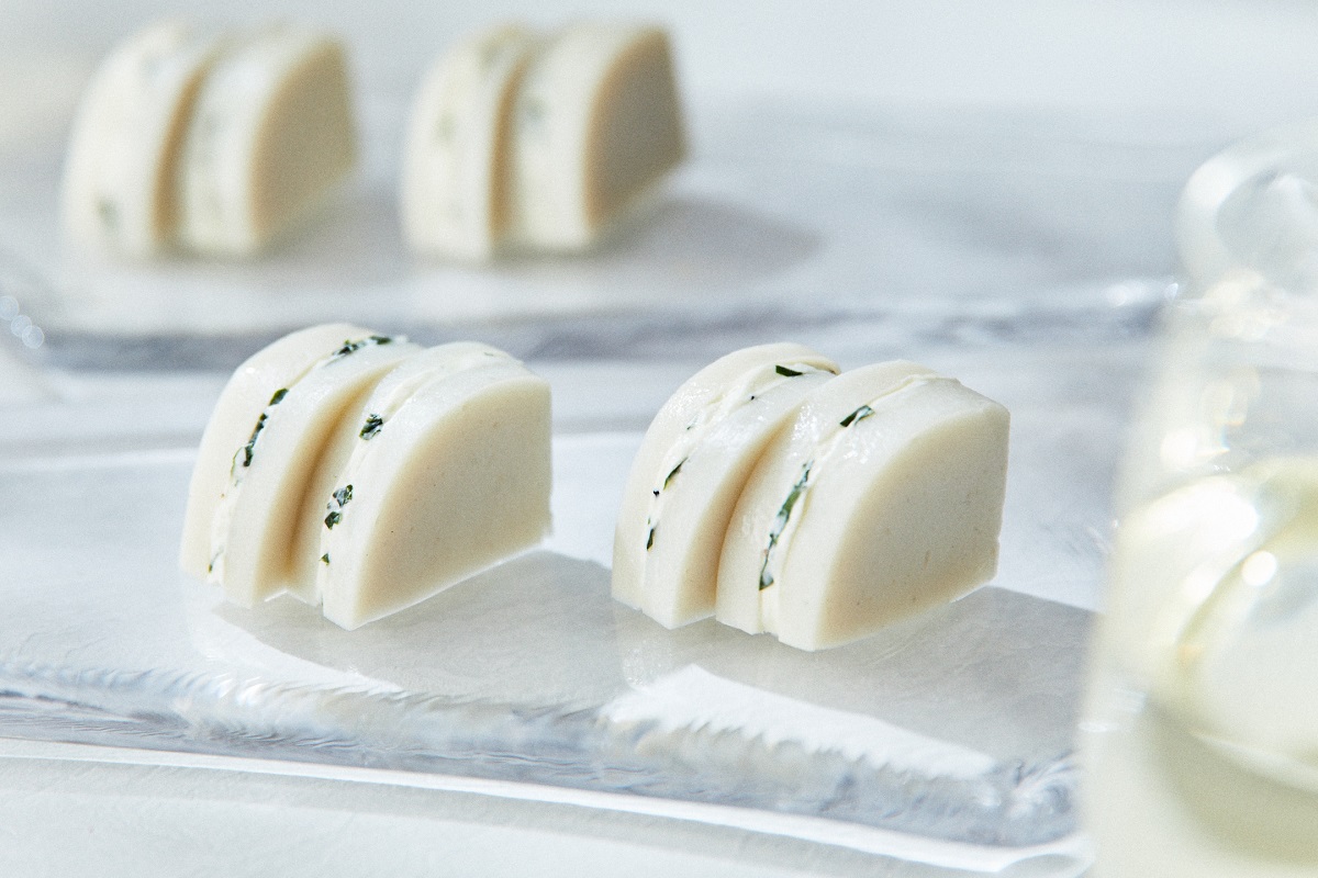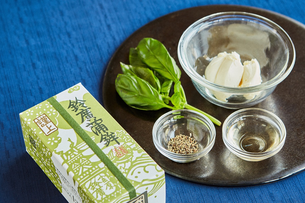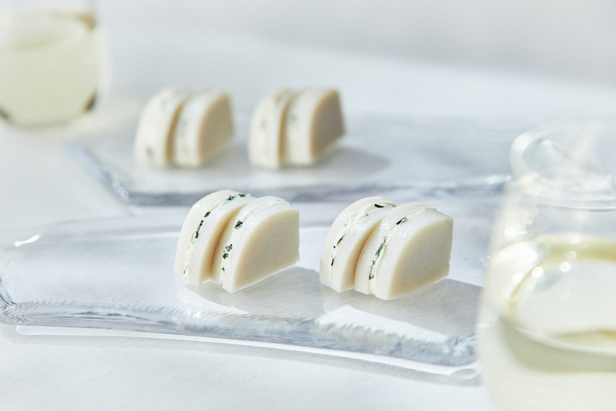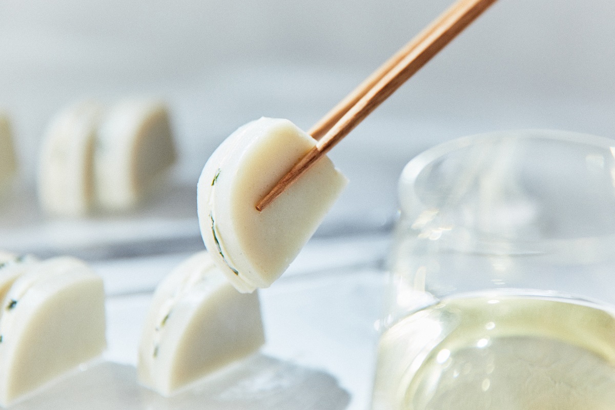 今回はかまぼこに、香草バジルと白ワインを加えたクリームチーズソースを挟んでお出しします。プリッとした弾力が生きて、大人な香りがよきアクセントです。