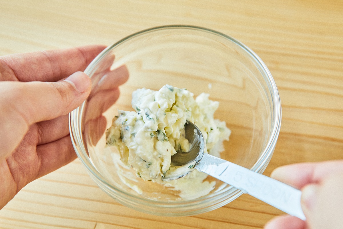 ② クリームチーズにバジルのみじん切り、白ワイン、ブラックペッパーを加えてよく混ぜる。