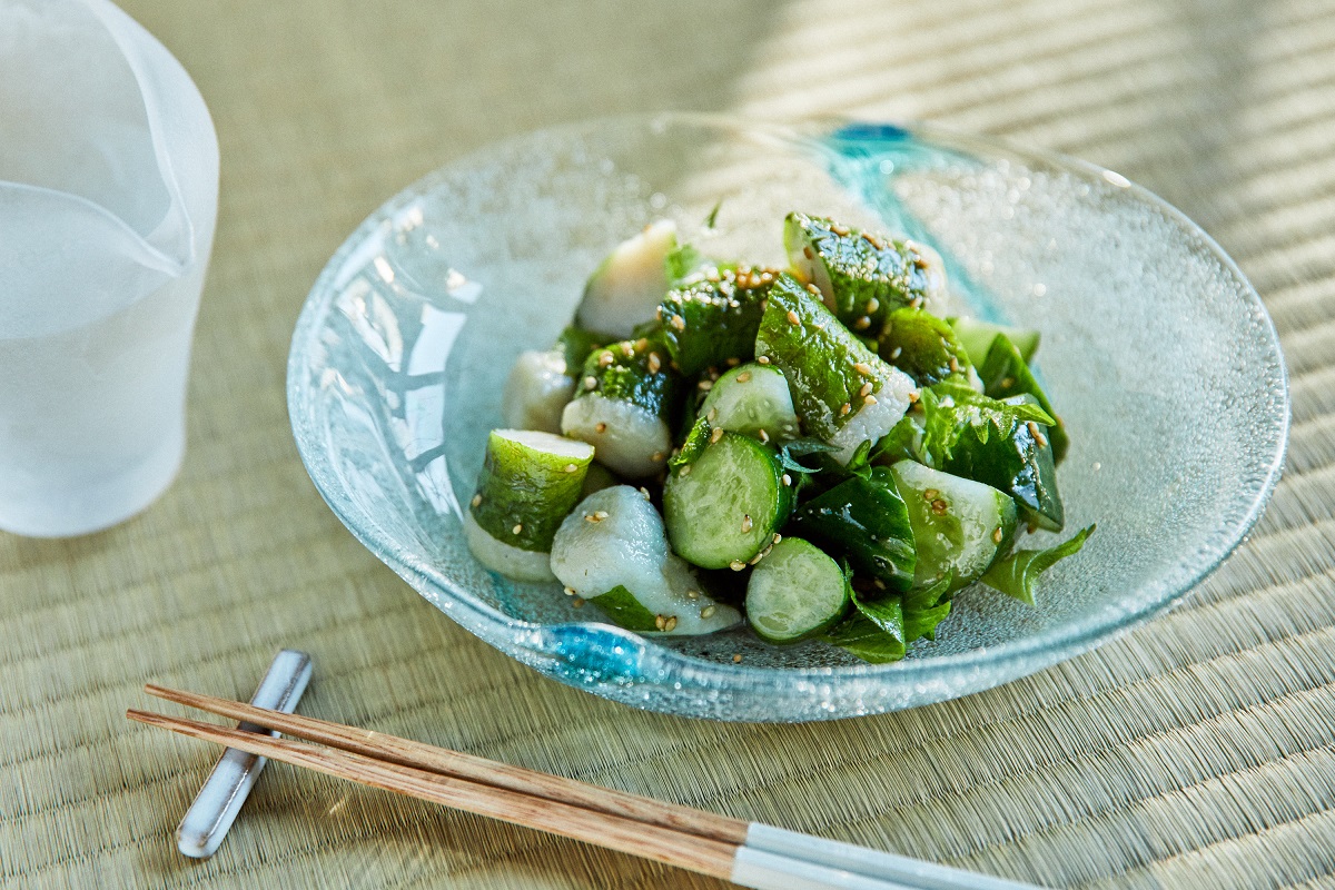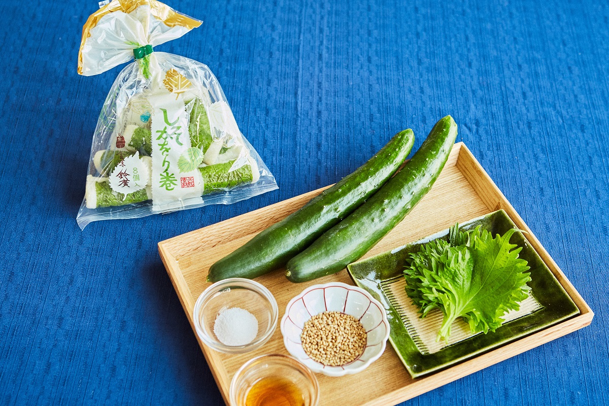「しそかをり巻」のプリッとした食感、胡瓜のシャキシャキとした歯ごたえを楽しむために、大きめに切るのがポイントです。胡瓜の大きさは「しそかをり巻」よりも一回り小さく切ると、いい塩梅です。