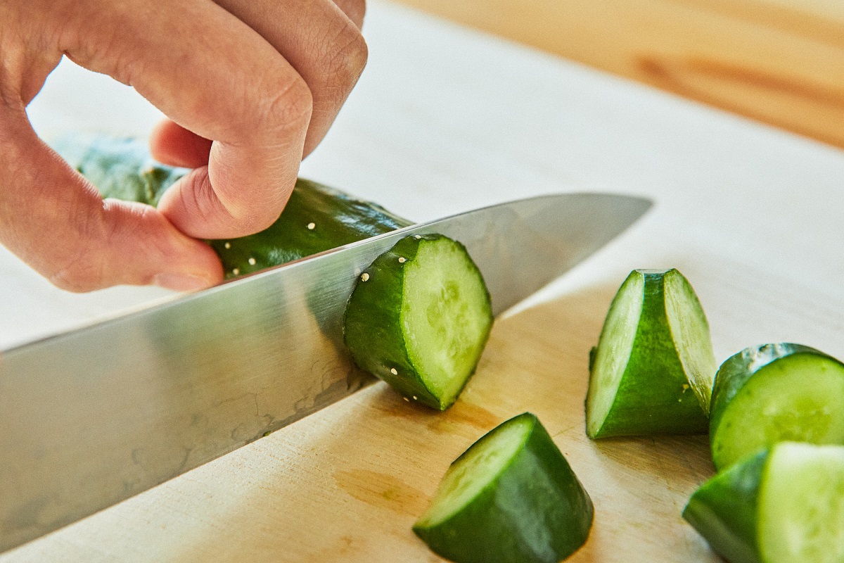 ② きゅうりを乱切りにする。その際に「しそかをり巻」よりも一回り小さくなるように。