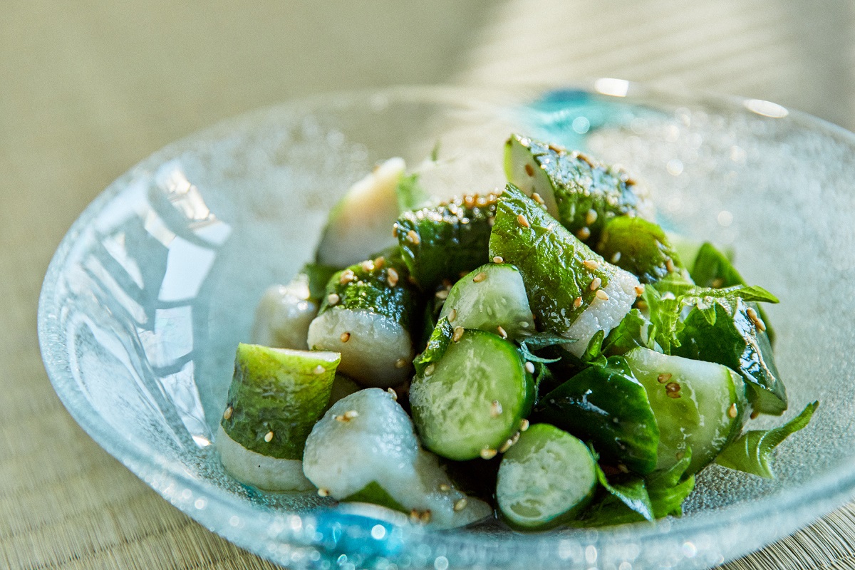 ③ 切ったきゅうりと「しそかをり巻」に刻んだ大葉と塩を振り、ごま油をかけて混ぜる