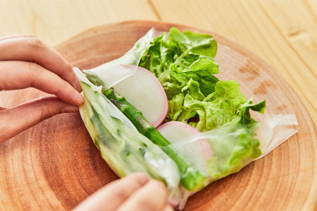 ④ ライスペーパーの手元にかまぼこを4枚ずらしながら並べ、きゅうり、アスパラ、リーフレタス、ディルの順に乗せ、手前から巻き両端を織り込んで最後まで巻く。