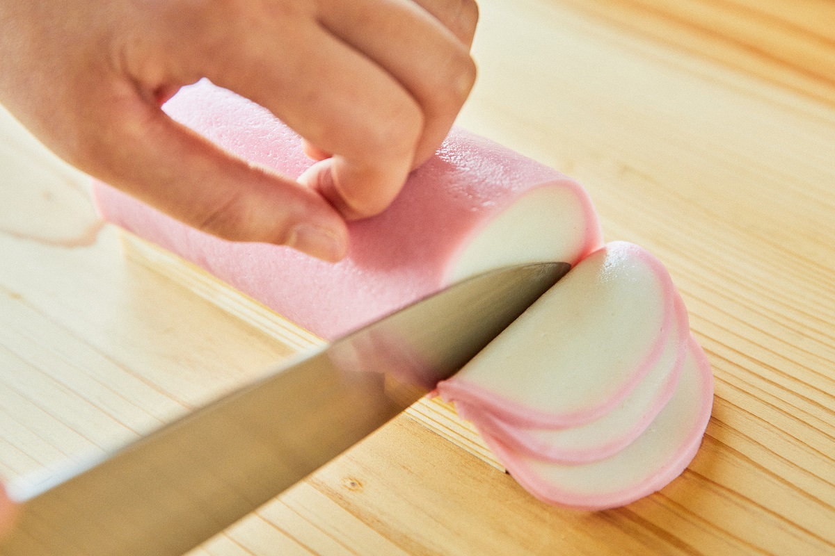 かまぼこの弾力は厚みによっても異なります。今回はつるりとした食感を楽しめるように2mm~3mmと薄くスライスしておりますが、しっかりとした噛み応えがお好きな方は12mmほどの角切りでお試しください。
