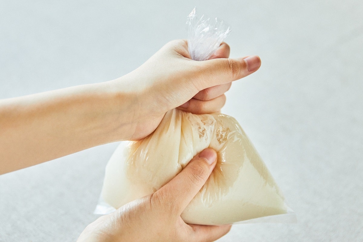 ① 200ccの水と万能すりみパウダー50gを袋に入れて良くもみ、すり身を作る。