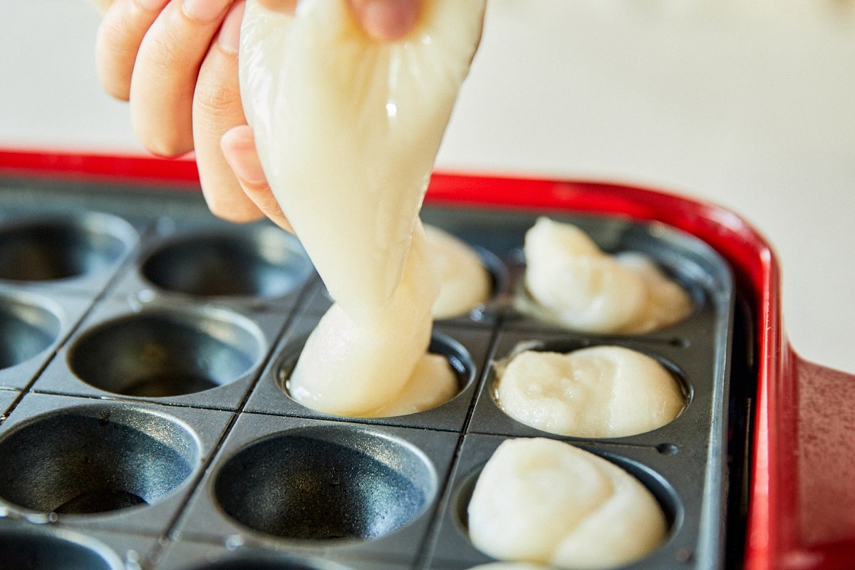 ③ 袋の端を切り、タコ焼きの生地を熱したタコ焼き機に流し込む。
