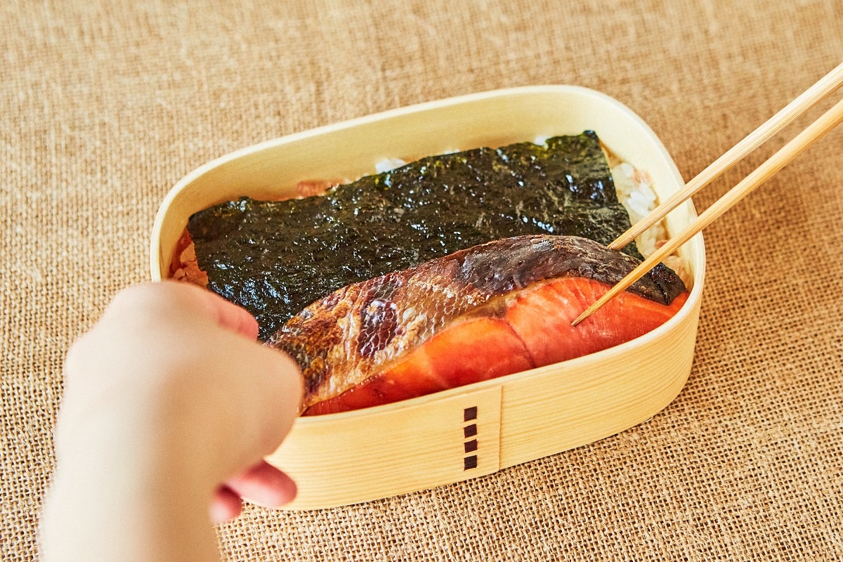 ④ こんがり焼き上げた、「べにさけ 粕漬け」を盛りつける。