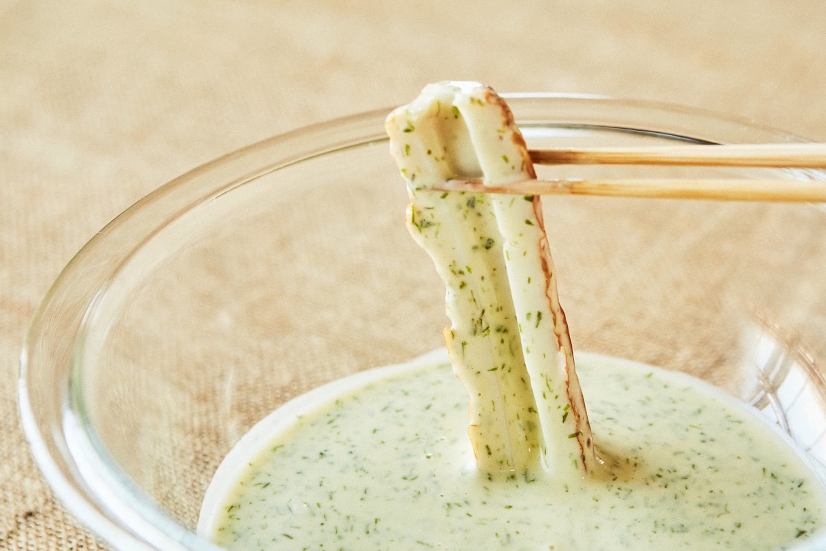 ① まず、磯辺揚げを作る。「百年ちくわ」を縦半分に切り、青のり、小麦粉、水を混ぜ合わせた衣につける。