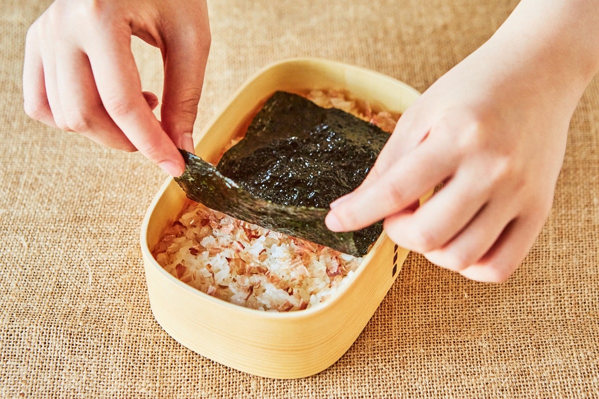 ③ お弁当箱にご飯を盛り、かつお節をふりかけ、醤油に浸した海苔を重ねる。