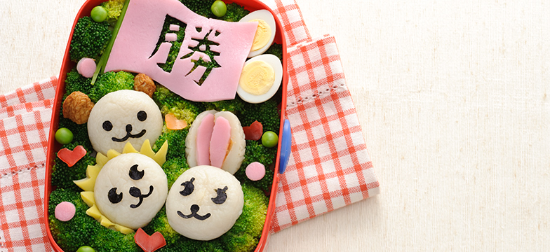 ママの応援のメッセージをお弁当に!お子様の運動会や発表会など様々な行事に、応援の思いを込めて「勝」のメッセージが印象的なかまぼこのお弁当です。「勝」の旗やくまさん、うさぎさんに使われているかまぼこは、栄養豊富で筋肉の疲労回復にもぴったりの食品。お子様を応援するお弁当におすすめです。