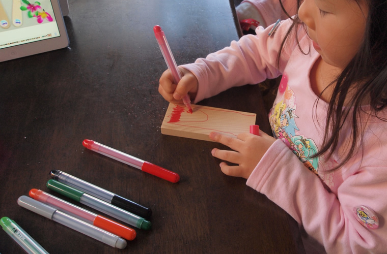 大きい画用紙を絵でうめ尽くすのはなかなかの重労働。かまぼこ板くらいの大きさであれば、自分の力で描ききれるよう。我が家の小さな子どもたちも、物怖じせずにどんどん描いていきます。