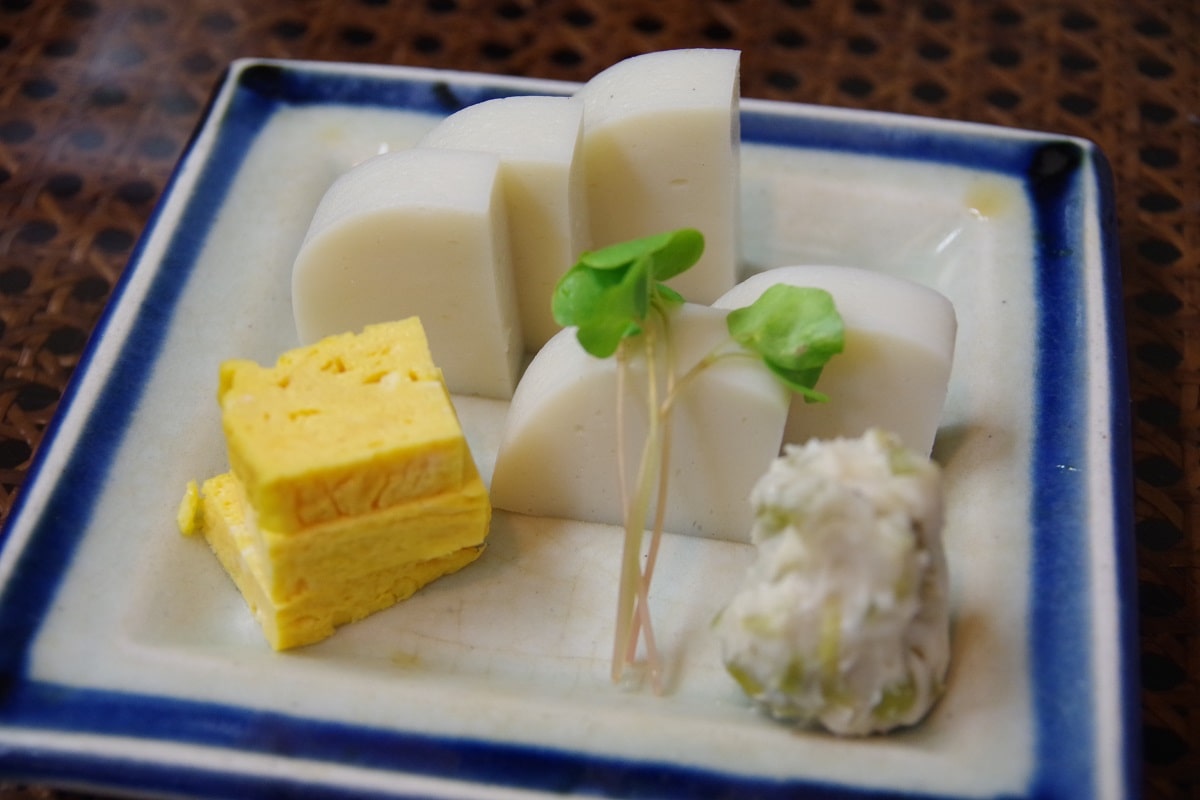 ここからは、出川さんおすすめの「蕎麦前」を3品ご紹介します。「板わさ」は、もちろん鈴廣のかまぼこ。爽やかな風味の伊豆・天城産わさび漬けと、やさしい甘さの厚焼きたまごがアクセントです。