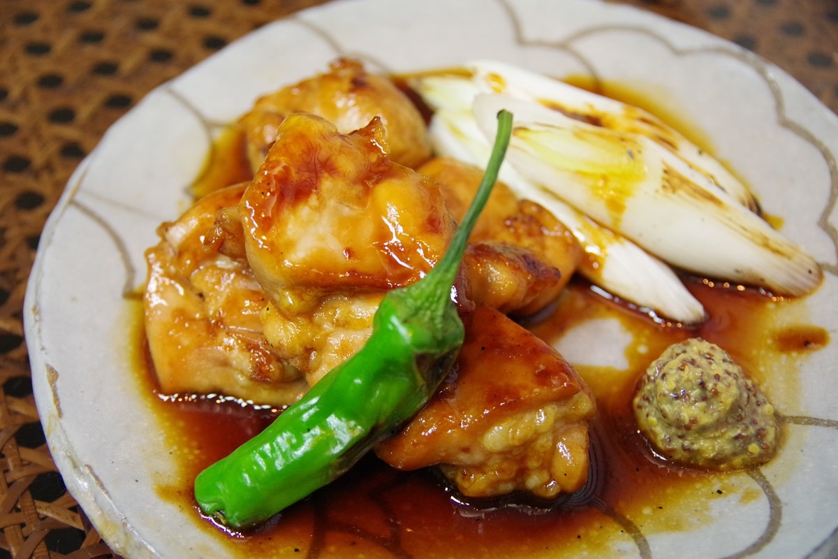 もう一皿は、不動の定番「やきとり」を選んでいただきました。利久庵のやきとりは、串に刺さない「くわ焼き」。甘辛いタレがふっくらジューシーな鶏肉と見事にマッチした、クセになりそうなおいしさです。