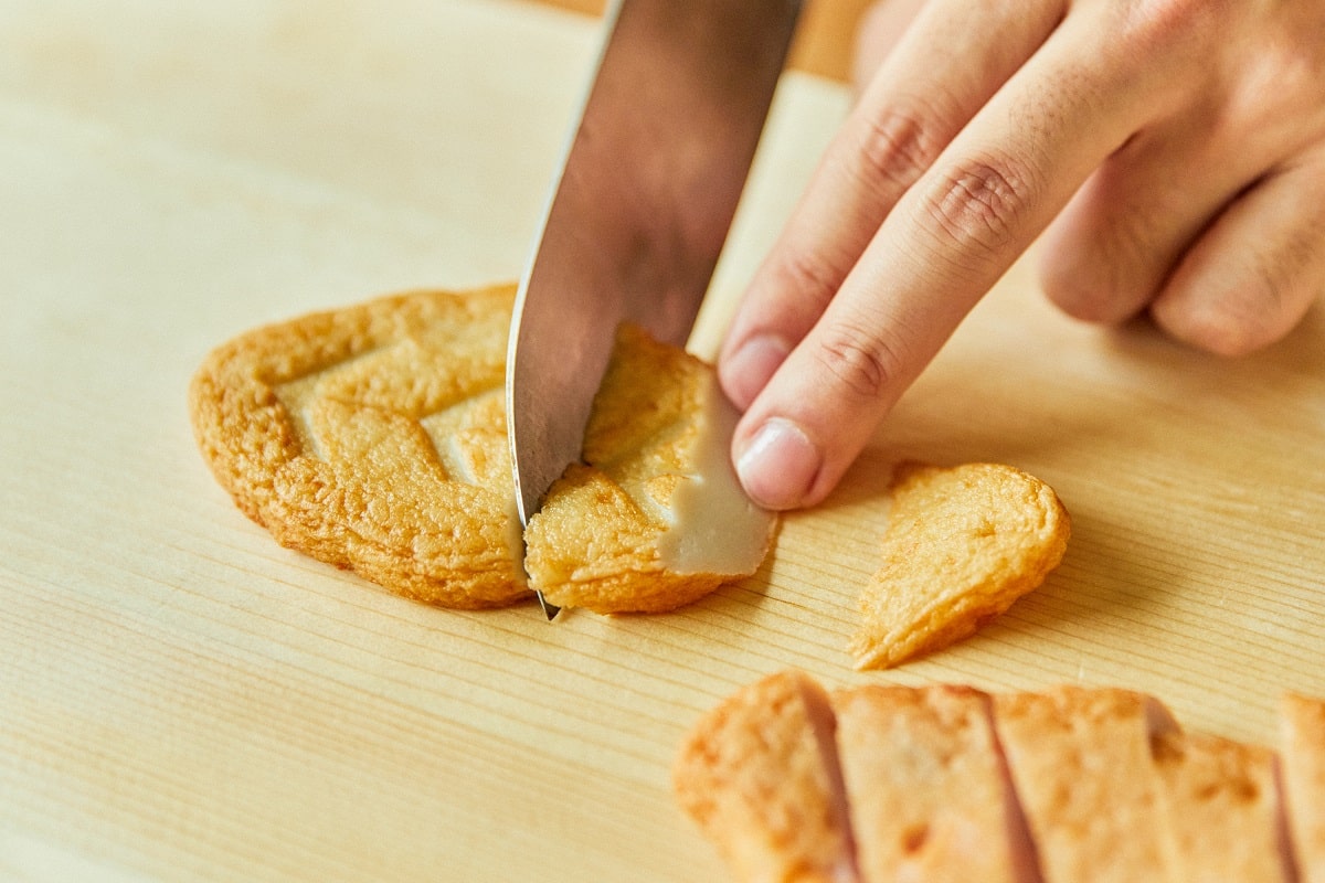 ② 「あげかま」を1.5cm幅で削ぎ切りする