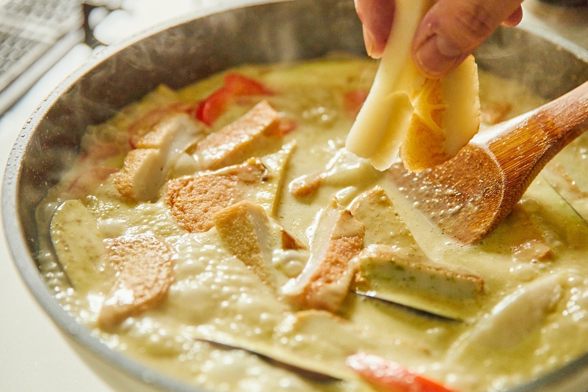 ④  グリーンカレーペーストとすりおろしにんにくを加えて炒め、ココナッツミルクを入れたら弱火で15分程煮込む