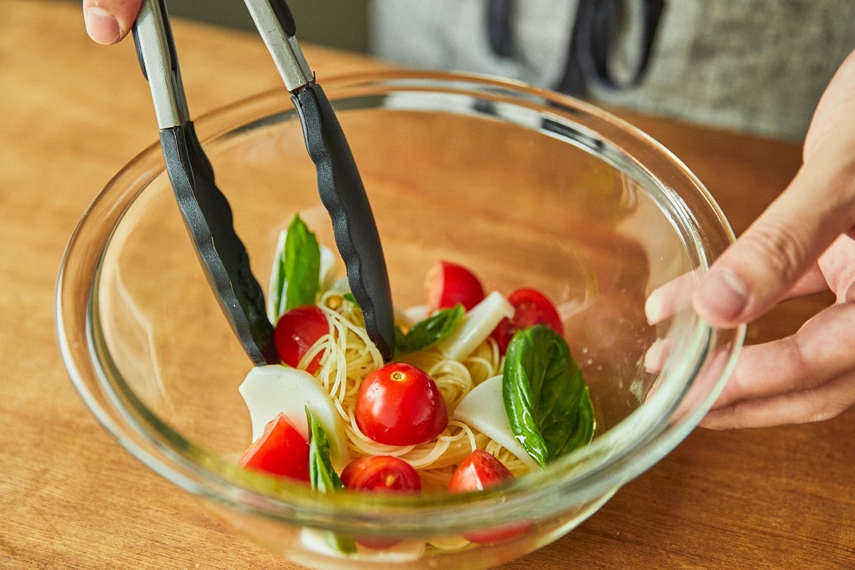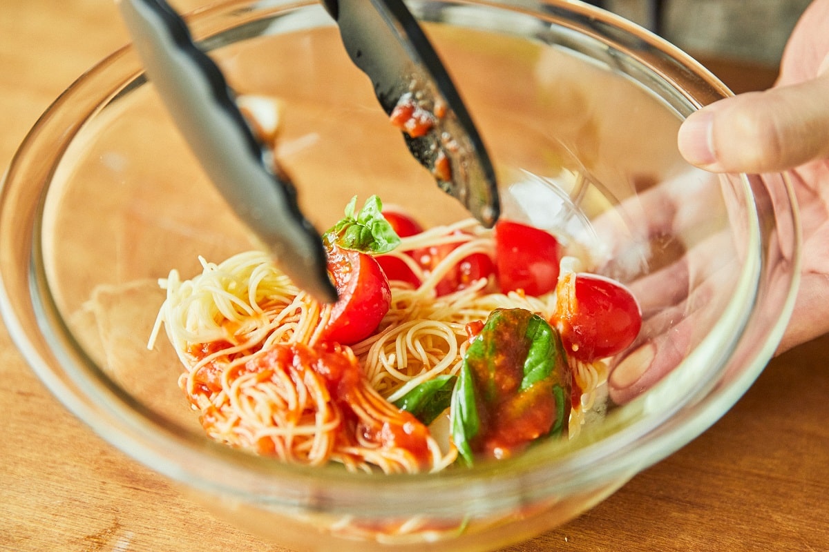 ④ ボウルにパスタ、かまぼこ、プチトマト、オリーブオイル、塩を入れて和える