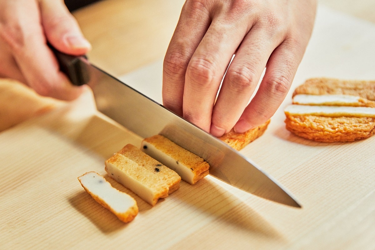 「あげかま」は白身魚のすり身に海老や青のりを混ぜ、新鮮な米油で揚げています。米油は酸化しにくく、油くささがなくさっぱりな後味に。