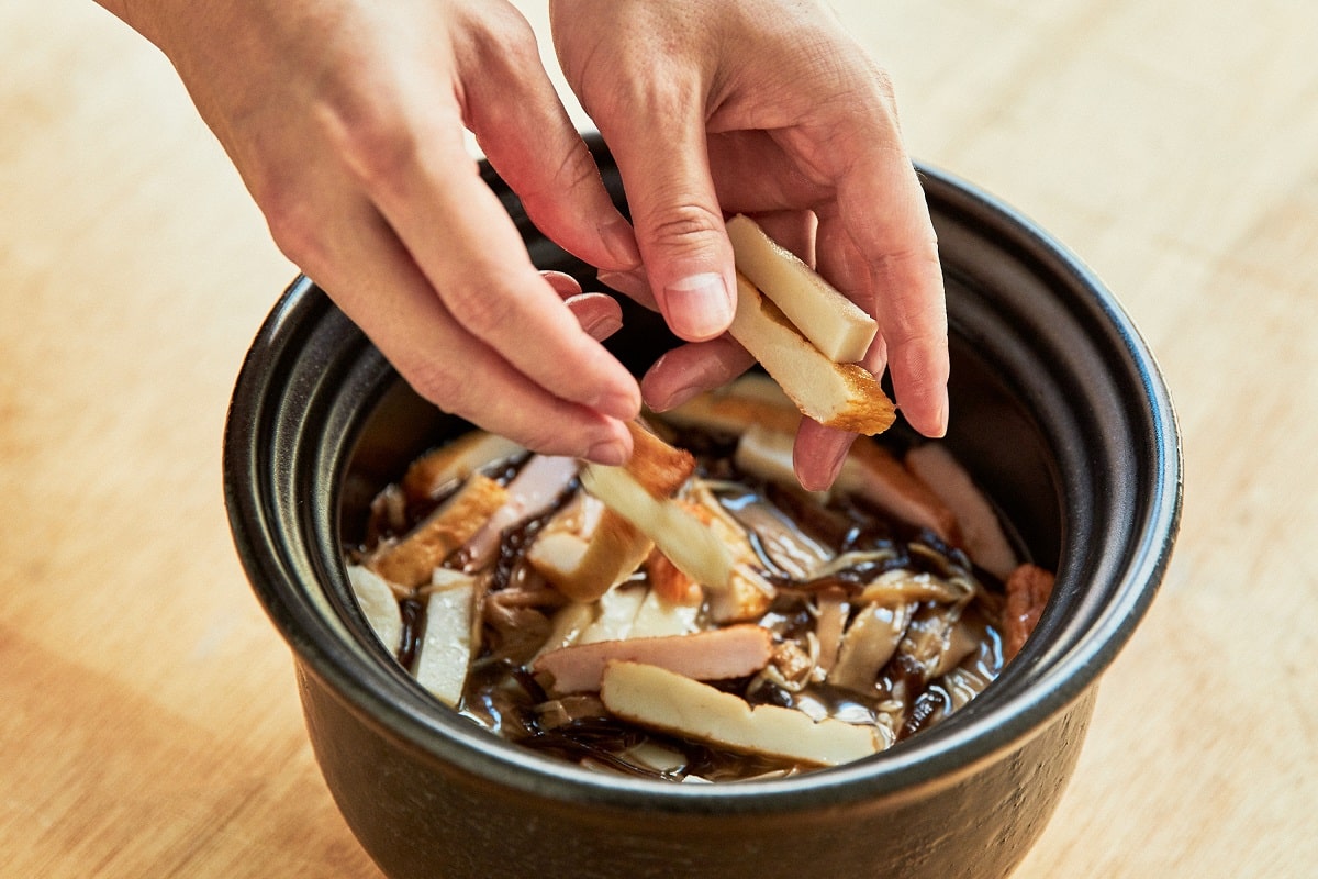 ③ 炊込みご飯の素と「あげかま」を釜に入れて混ぜる。炊飯する