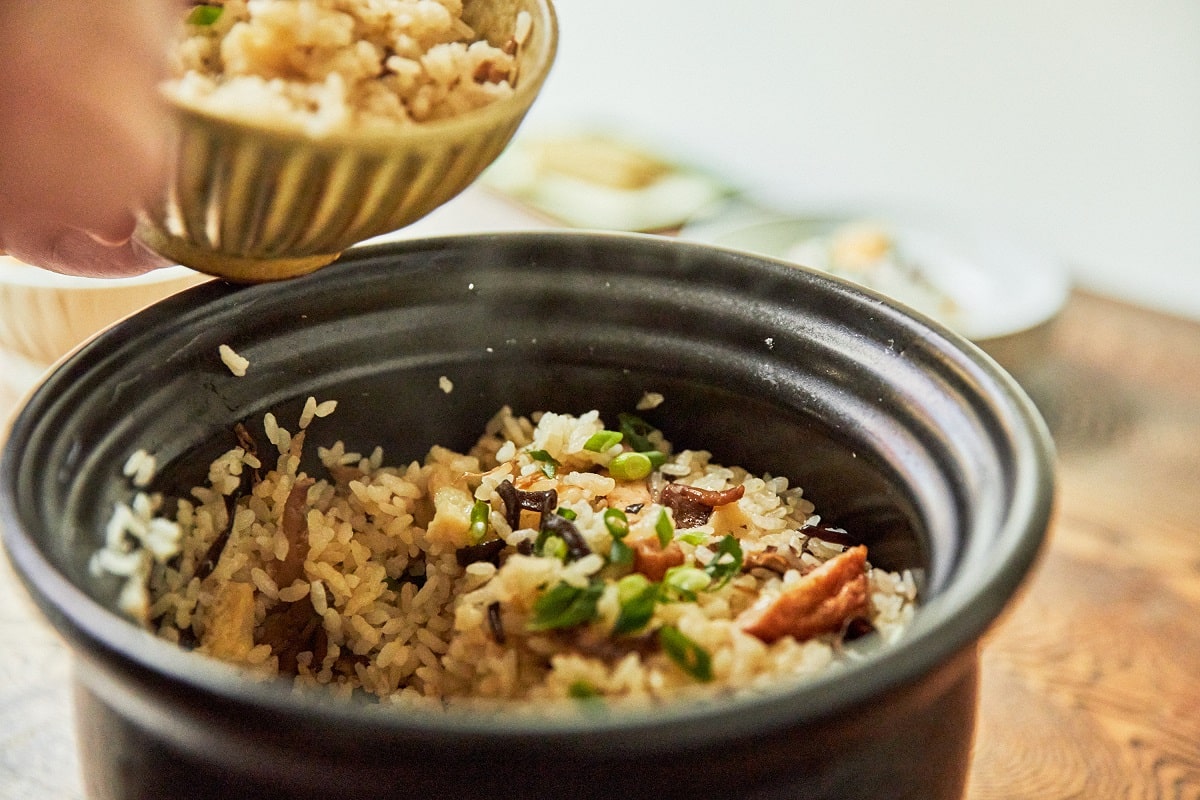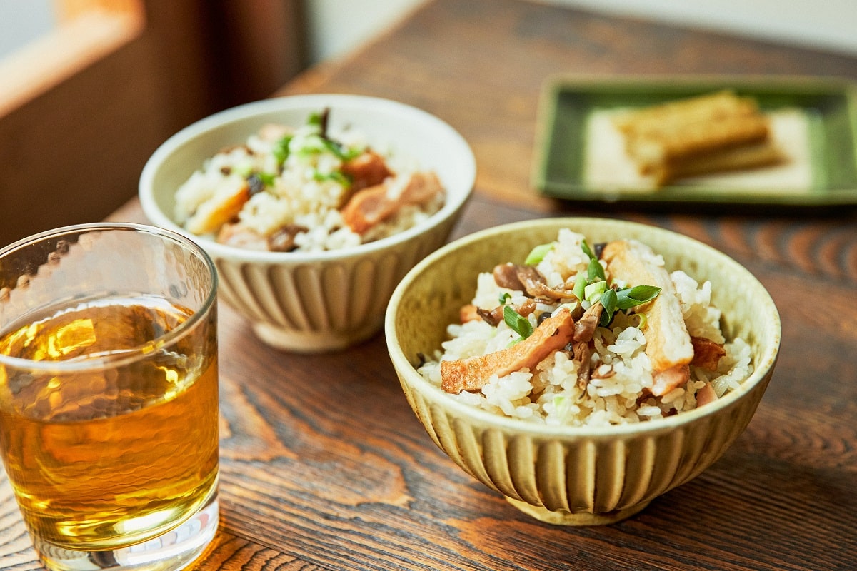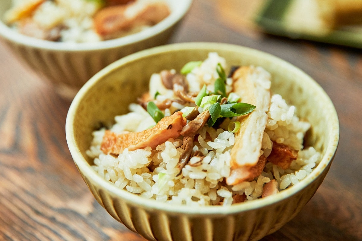 今回は秋らしい炊き込みご飯。白身魚のすり身に海老や青のりを加えて揚げた「あげかま」と一緒にお米を炊いて、魚の旨みがじんわりと染みいる一皿です。
