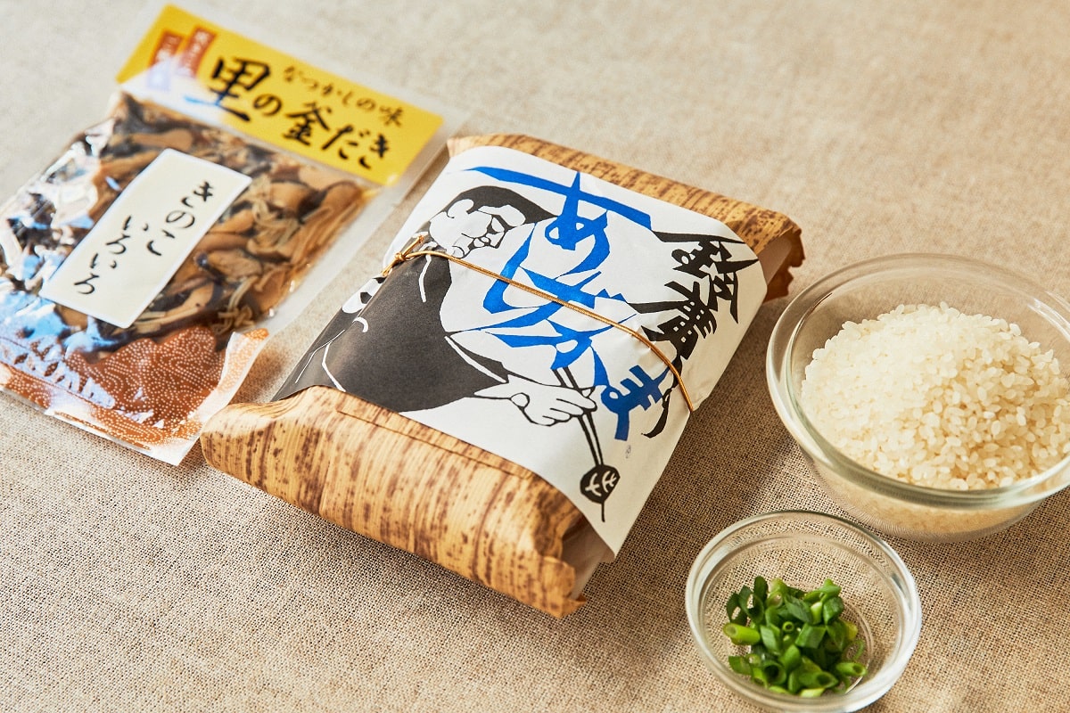 「あげかま」と炊き込みご飯の素、ごぼうの醤油漬けを詰め合わせた、本レシピのための秋限定セットです。