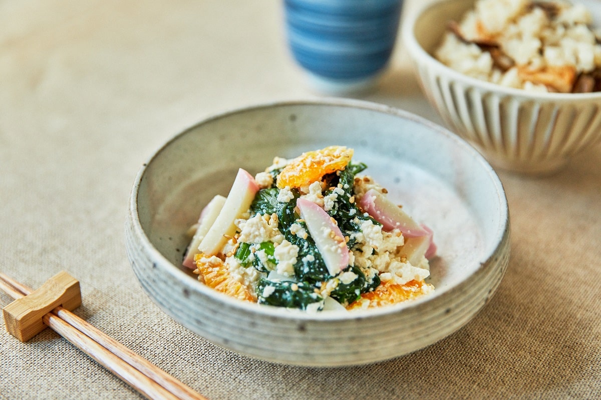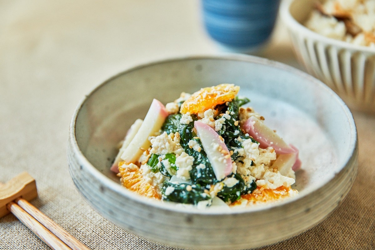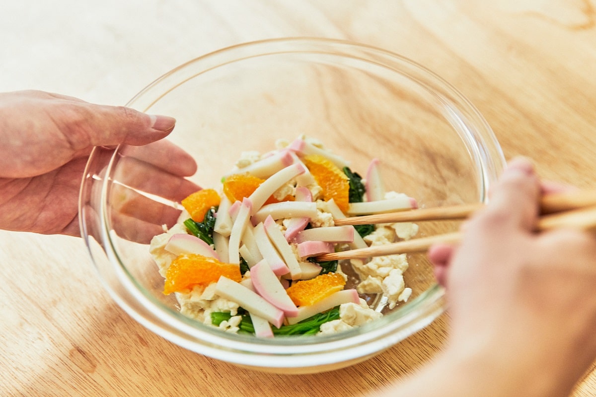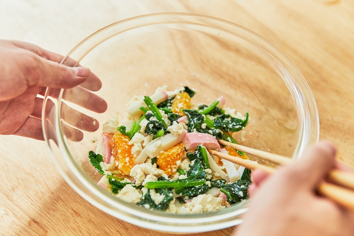 今回は口当たりのよい白和えに。野菜や果物だけではなく、かまぼこを白和えに加えてみてください。タンパク質もとれる上、プリッとした食感が一段とよい一皿に仕上がります。