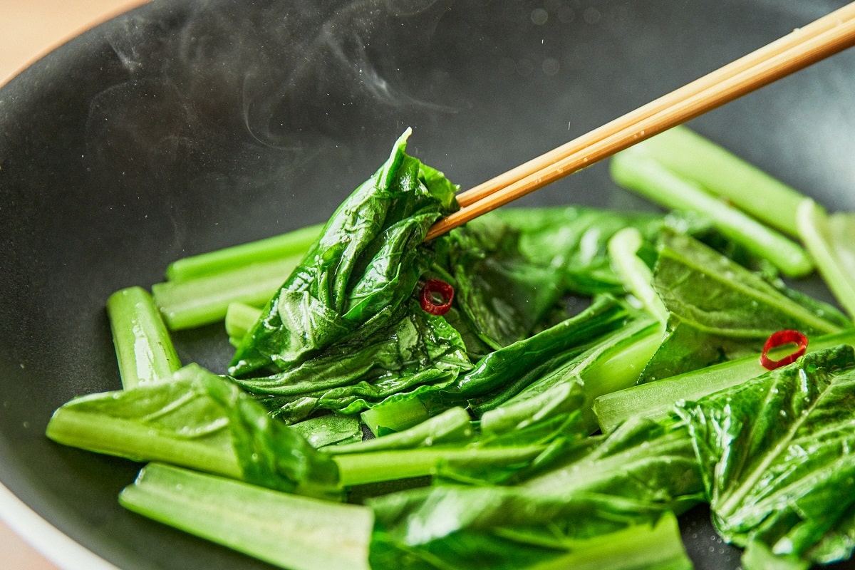 ⑤ にんにくの香りがしたら小松菜を入れ、葉がしんなりとするまで炒める