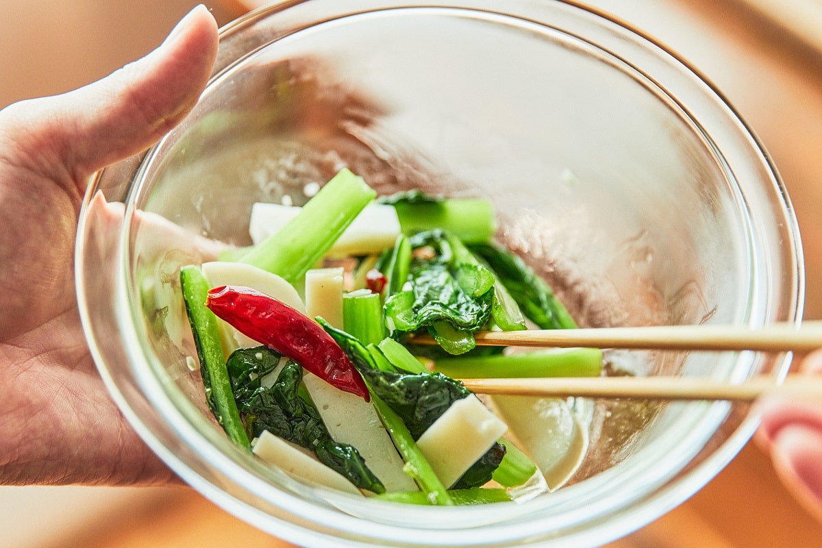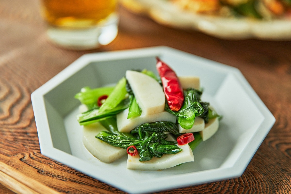 今回はかまぼこの旨みや甘みを引き出してくれる、ほんのり苦みのある小松菜を使いました。青梗菜やインゲンなど、お好みの野菜でお試しください。