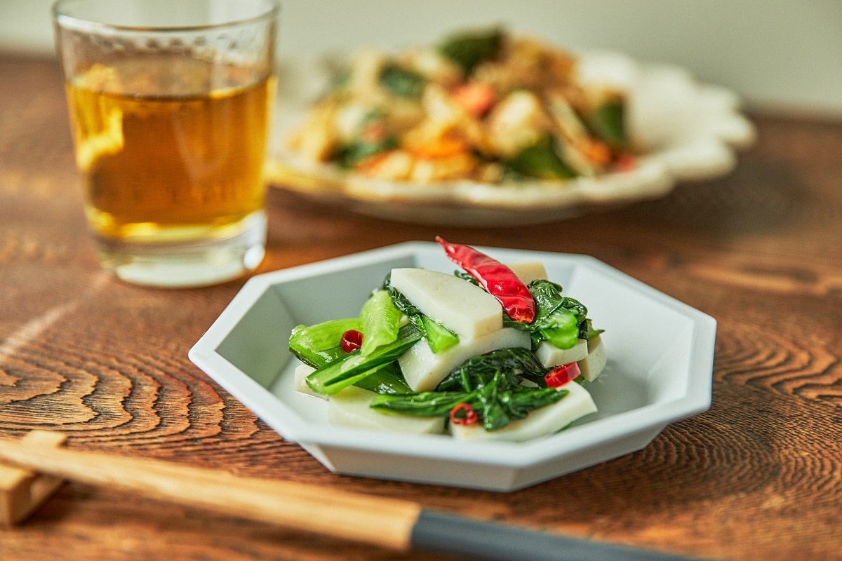 今回は「謹上蒲鉾と小松菜のピリ辛和え」を作ります。「謹上蒲鉾」は白身魚本来のぷりっとした弾力を味わうことのできる板かまぼこ。野菜料理にを加えると、タンパク質がとれる上、弾力や旨みも増えて満足感のある一皿になります。