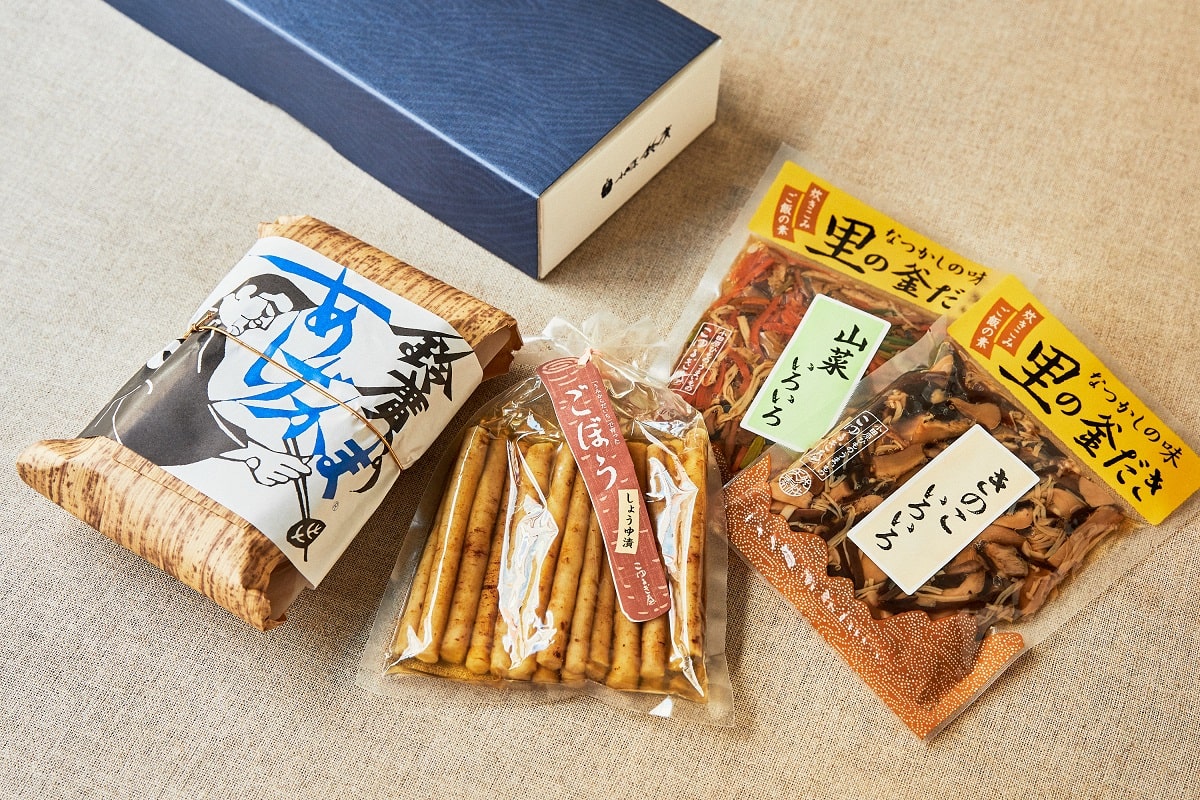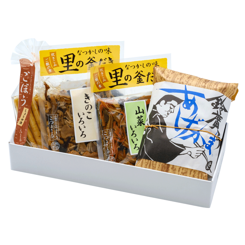 商品内容:あげかま、里の釜だき きのこいろいろ、里の釜だき 山菜いろいろ、ごぼう醤油漬け