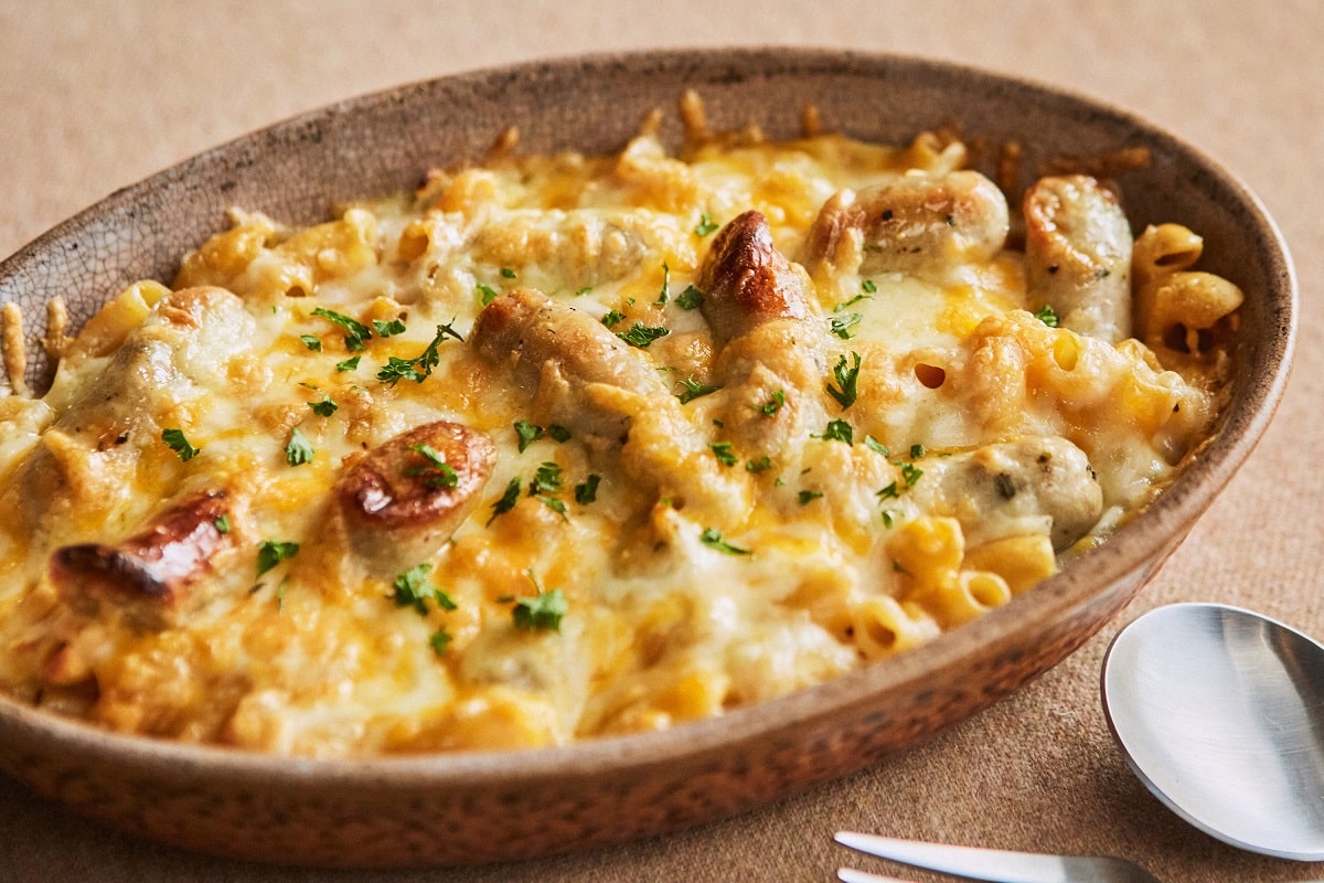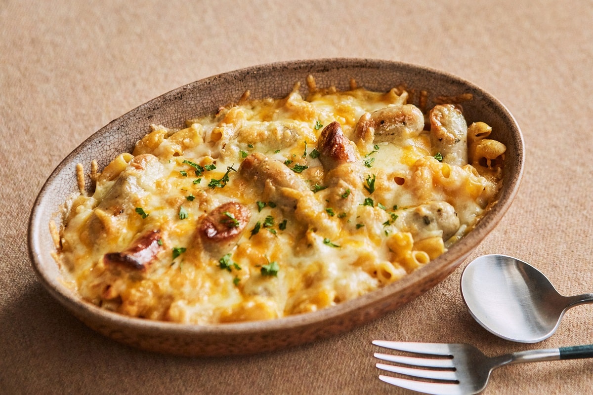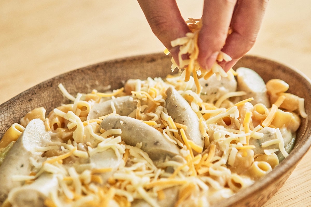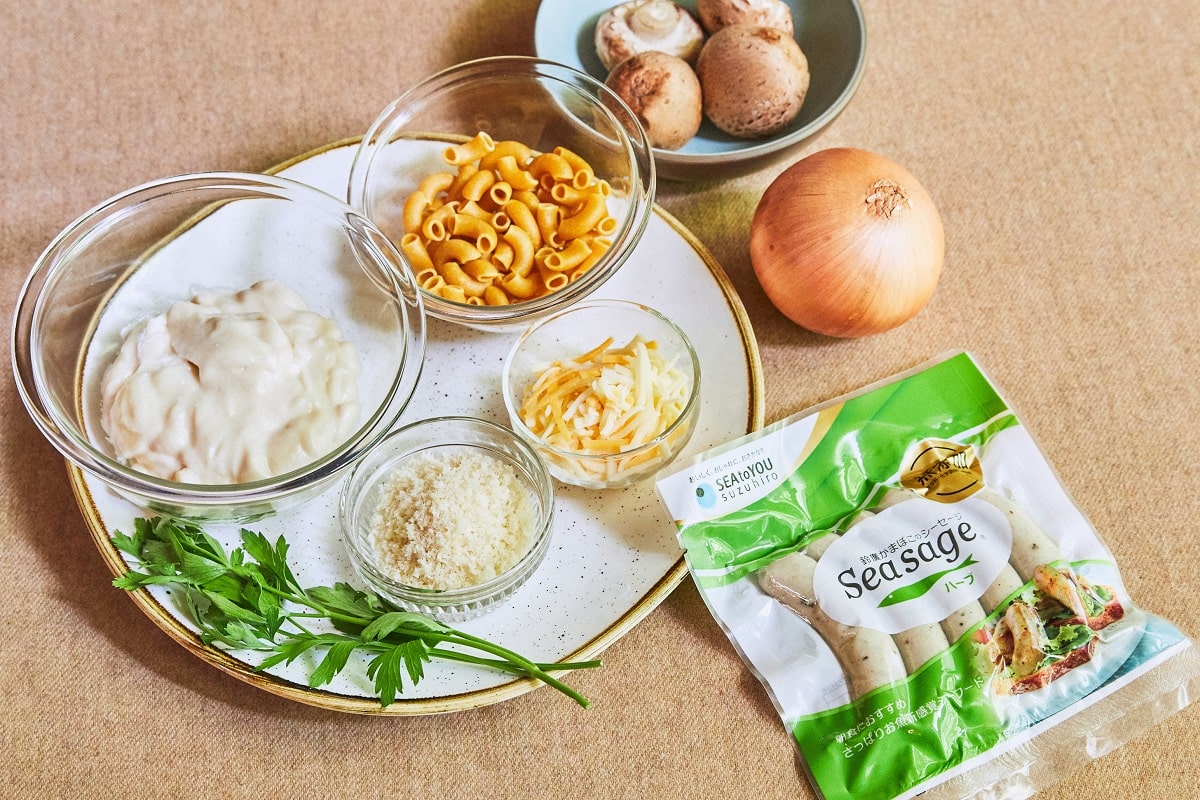 ④ マカロニ、シーセージ、玉ねぎ、マッシュルーム、ホワイトソースを耐熱皿に入れる
