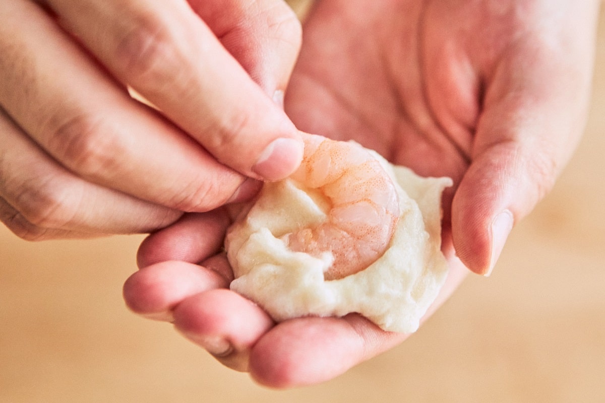 ⑥ ⑤のすり身の生地で`えびを包む