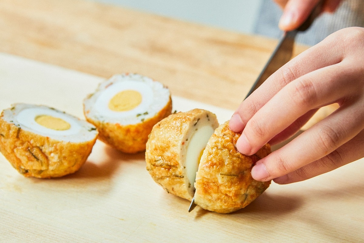 鈴廣のおでんを作るポイントは煮込まないこと。「かにはんぺん」のふわふわ、「れんこん揚げ」のシャキシャキ、「海老こがね」のぷりぷりなど、ひとつひとつのすり身の食感を楽しむためには、ぐつぐつ煮込まずにさっと5分ほど温めてください。