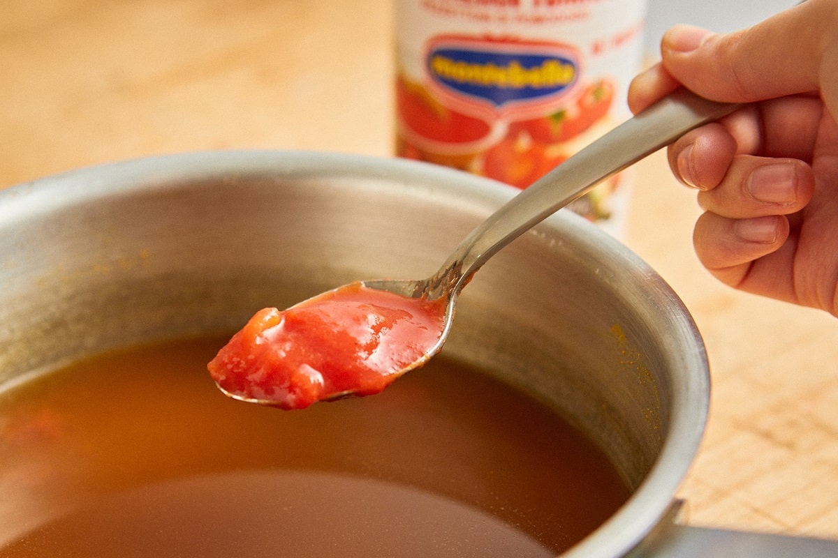 ② 水、コンソメ、トマト缶を鍋に入れて沸騰させる。