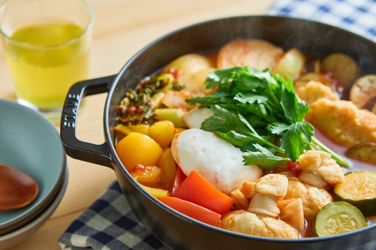 今日はトマトや野菜をたっぷり入れた魚介との相性もとてもよい「ラタトゥイユおでん」を作ります。とろけるチーズを最後に加えたら、食卓に歓声があがるかも。
