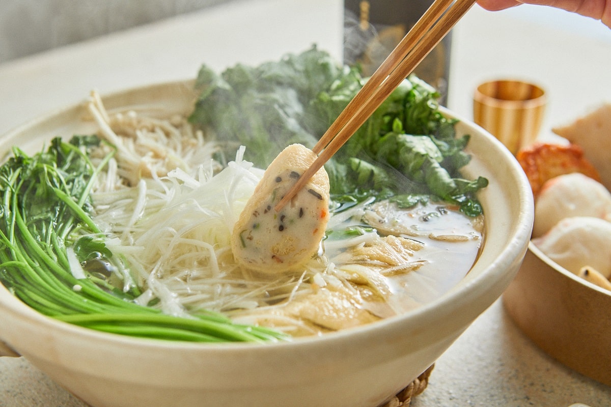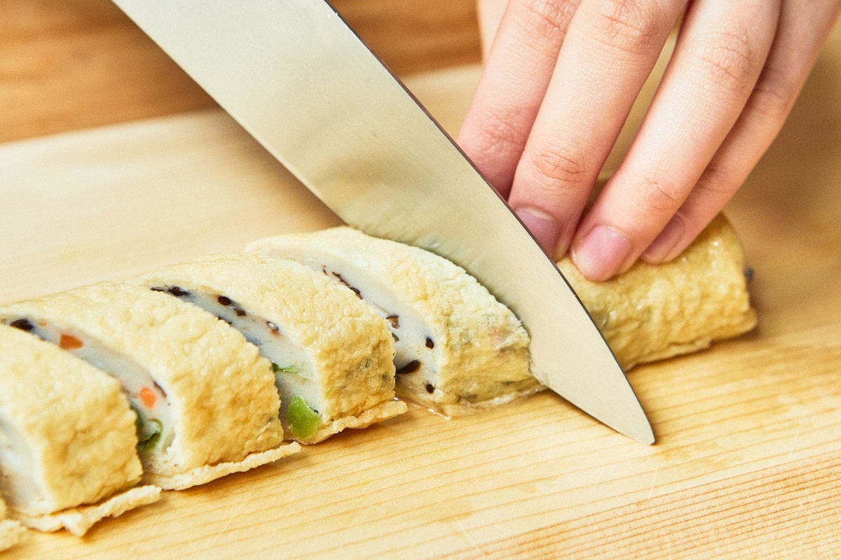 鈴廣のおでんを作るポイントは煮込まないこと。「かにはんぺん」のふわふわ、「海老こがね」のぷりぷりなど、ひとつひとつのすり身の食感を楽しむためには、ぐつぐつ煮込まず、温めるだけ。今回のしゃぶしゃぶでは薄くスライスするので、数分ほどで十分です。