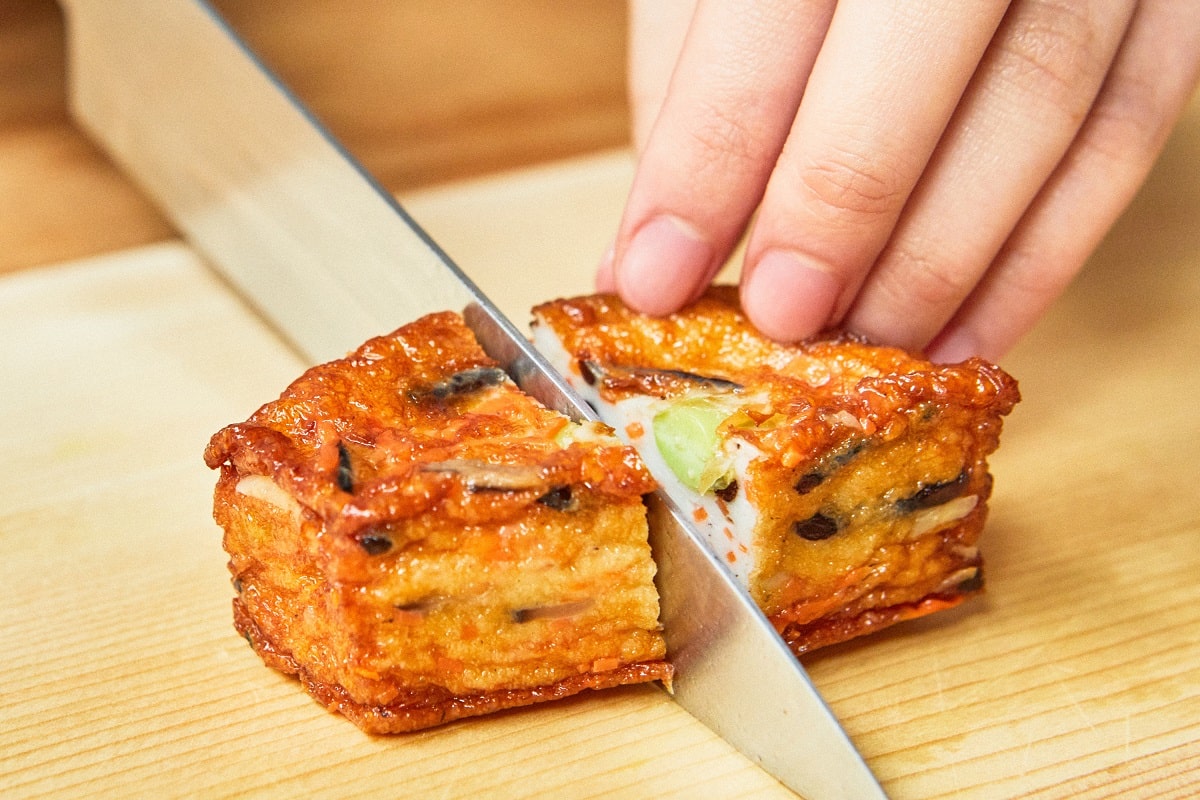 鈴廣の「職人づくり おでん鍋」には15種類のおでん種とおでん出汁がついています。職人がおでん特製のすり身を作り、海老やとうもろこし、餅などを包み、香ばしく米油で揚げます。