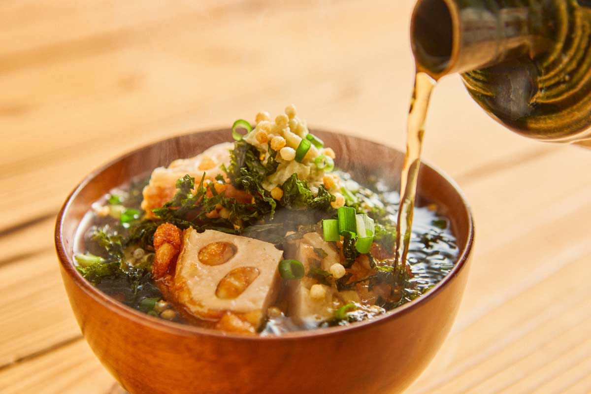 ④ ③の上に、炙り海苔、わざび漬け、あられ、ネギの順にのせ、①の出汁をかけて召し上がれ。