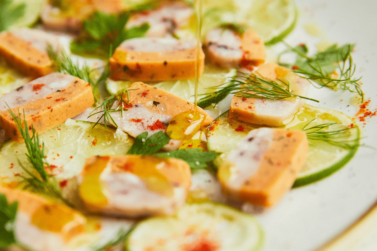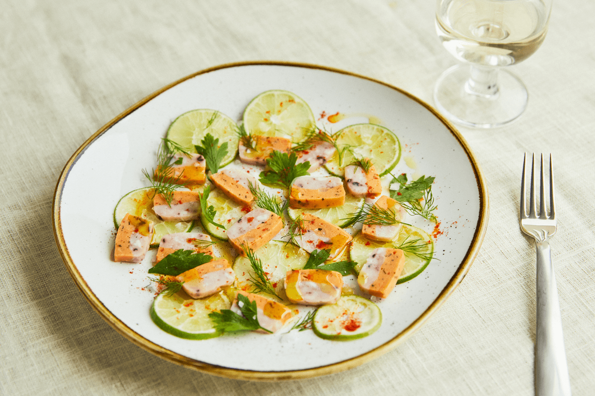③ 薄く切った「FPB イカとタコのガリシア風」、ライムをお皿に敷き、その上に塩・イタリアンパセリ、ディルを盛り付ける