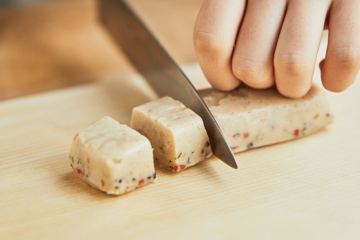 FPBシリーズの一つ「FPB 金目鯛と鯵のアクアパッツァ風」はイタリア料理のアクアパッツァからアイデアを得て、白身魚のすり身に、ほっくりとした金目鯛と旨みの強い鯵をふんだんに混ぜました。また、トマトや赤ピーマン、バジルなどのイタリアらしい野菜やハーブをプラスして、爽やかな味わいに仕上げています。